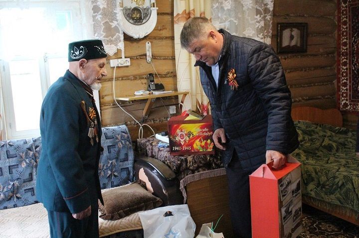 Глава района посетил ветеранов Зарипова Ханифа Зариповича в селе Тубылгы Тау и Габбасова Мансура Габбасовича в селе Зиреклы. Он поздравил их с наступающим праздником и вручил открытки и продуктовые наборы.