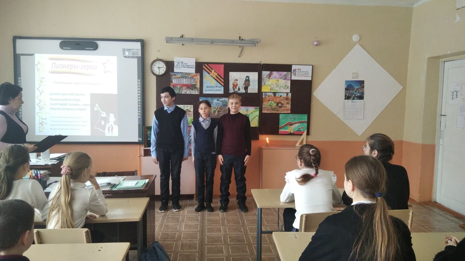 В рамках месячника гражданско-патриотического воспитания в школе и в целях увековечивания подвига советского народа, победившего в Великой Отечественной войне и создания условий для формирования высокого патриотического сознания в преемственности поколений, был проведен классный час-лекторий «Великий подвиг Великой страны», который прошёл в 5-8 классах. С искренним интересом слушали дети о пионерах — героях, которые, отложив недочитанные книжки и школьные учебники, взяли в руки винтовки и гранаты. Наравне с взрослыми они защищали свою Родину от немецких захватчиков, неутомимо работали в цехах заводов и на колхозных полях. Многим из них не суждено было дожить до Победы. Хочется верить, что в памяти школьников останутся имена пионеров-героев, таких, как Марат Казей, Леня Голиков, Надя Богданова, Лара Михеенко, Зина Портнова, с биографиями, которых они познакомились на мероприятии. Ребятам была показана презентация «Пионеры герои», где они увидели своих ровесников, в тылу и на фронте сражающихся с фашистскими захватчиками.