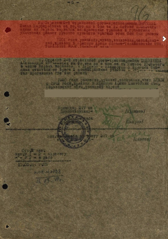 В редакцию Тетюшской районной газеты "Авангард" пришел наш земляк Сергеев Николай Николаевич, чтобы поделиться счастливым известием - на сайте "Подвиг народа" он отыскал своего деда Сергеева Ивана Порфирьевича. Вот выдержка из наградного листа, датированного 10 марта 1944 года: "Представить к высокой награде стрелка 9-й стрелковой роты 247 стрелкового полка - красноармейца Сергеева Ивана Порфирьевича за то, что он в бою за д. Котово 10 марта 1944 года одним из первых ворвался во вражеские траншеи и гранатами уничтожил расчет ручного пулемета врага. В этом бою он был ранен". С гордостью рассказывает про своего дедушку Николай Николаевич: "Он был 1901 года рождения. Прошел Гражданскую войну, защищал Родину на фронтах Отечественной. За боевые заслуги награжден медалью "За отвагу". Высокий был, мышцы литые, в шрамах от ранений тело. Прожил всю жизнь с осколком в груди. Так и умер с ним в 94 года, с войной... Я многим обязан деду. Правильной жизнью он жил, - продолжил Николай Сергеев повествование. - Не пил, не курил. Трудился сам и нам внушал, что бездельничать нельзя. Сколько помню, всё в работе: пчелы, скотина, огород. Помогал всем советом и чем мог. Доброта его была безгранична. Нас, внуков своих, возил каждое лето в Казань. Как Лев Толстой, такой фактурный, с бородой густой, в начищенных до зеркального блеска сапогах, подпоясанный. Цирк, музей, зоопарк - для нас это было сказкой. Бережливый был, но щедрый. Его пример - наука на всю жизнь. Похоронен он в с. Иоково Тетюшского района".