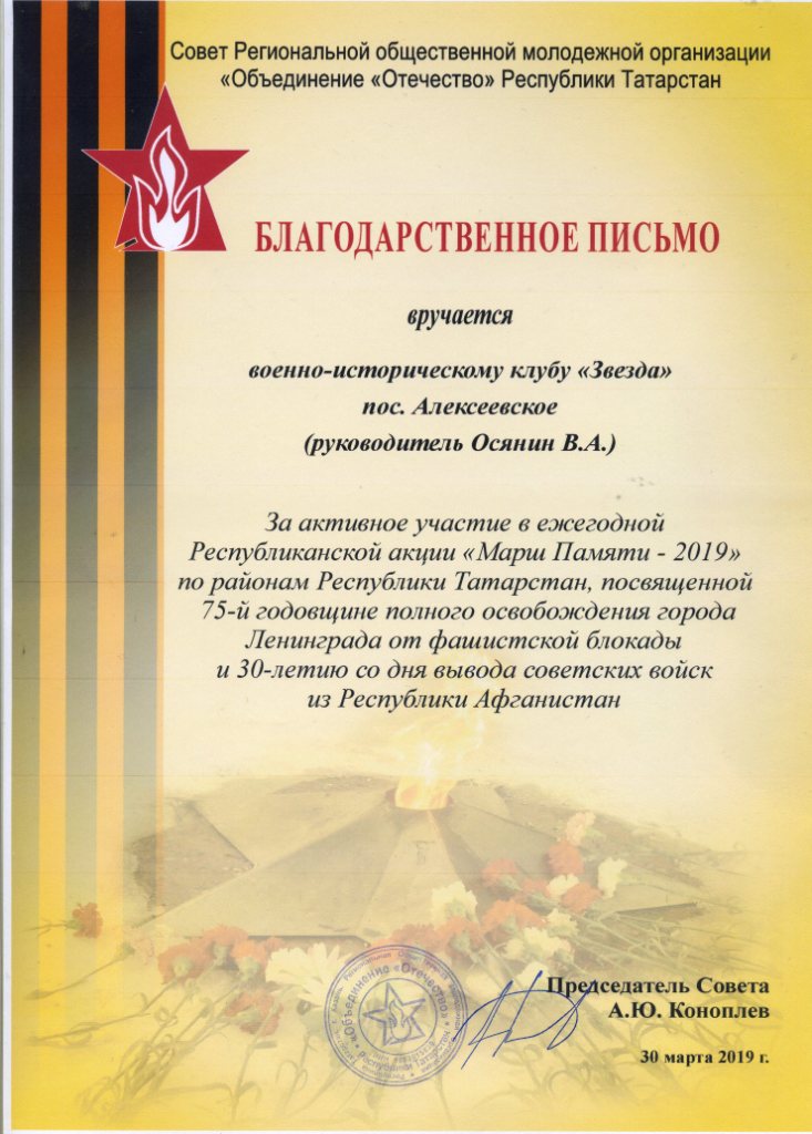 Военно-исторический клуб и поисковый отряд "Звезда" получил благодарственное письмо от Совета Региональной общественной молодёжной организации "Объединение "Отечество" Республики Татарстан за активное участие в ежегодной Республиканской акции "Марш Памяти". В 2019 г. марш был посвящён 75-й годовщине полного освобождения Ленинграда от фашистской блокады и 30-летию со дня вывода Советских войск из Республики Афганистан.