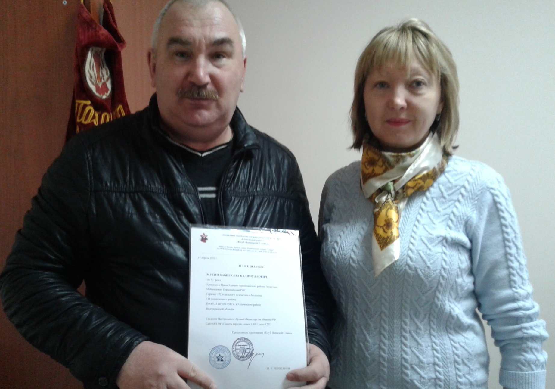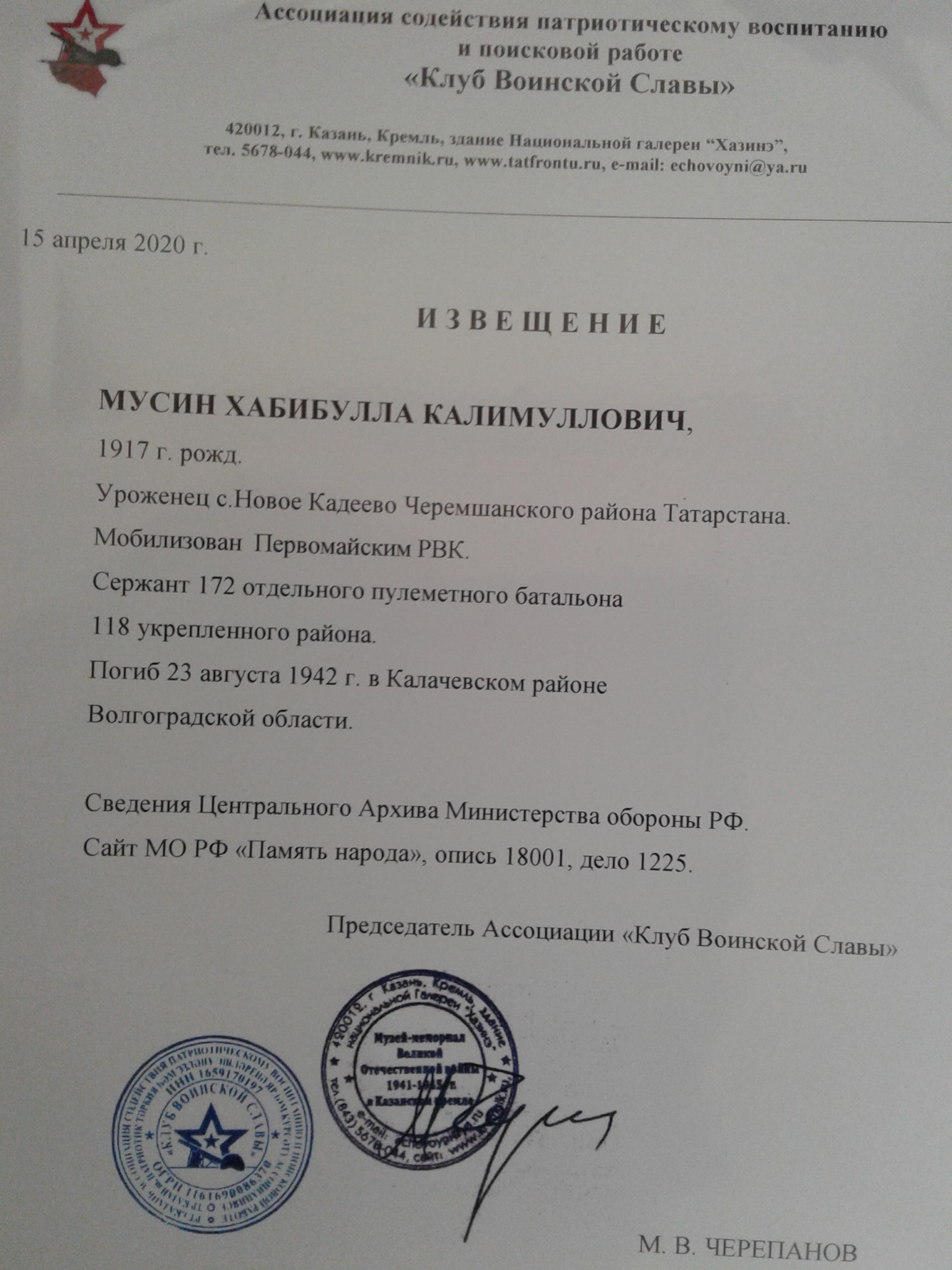 В преддверии Великой Победы участились обращения в Мемориальный центр по электронной почте черемшанцев, ищущих погибших и пропавших без вести на фронтах Великой Отечественной своих родственников. Прошло более полувека и получить хоть какую-то информацию, а тем более найти дату и место гибели солдата удается не всегда. Сотрудники Мемориала обращаются в архивы, в поисковые организации, сотрудничают с республиканским «Клубом Воинской Славы» и т.д. М.В.Черепанов, являющийся Председателем Ассоциации, помог восстановить судьбу нашего земляка, уроженца с. Новое Кадеево, погибшего 23.08. 1942 г. на Волгоградской земле, Мусина Хабибуллы Калимулловича. Извещение о гибели Мусина Х. К. будет вручено сыну солдата Мусину Кираму через Главу сельского поселения Аминова М.М.