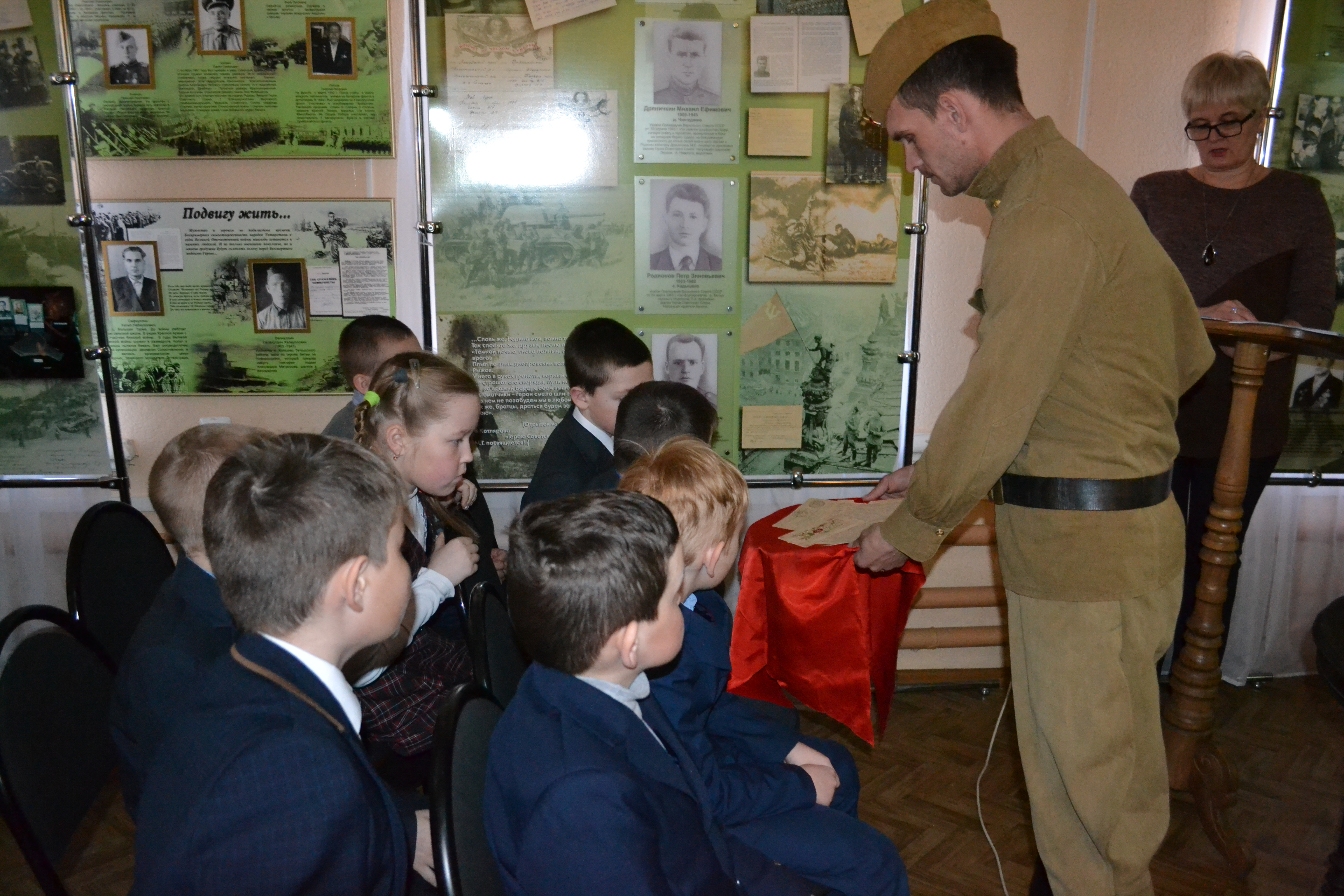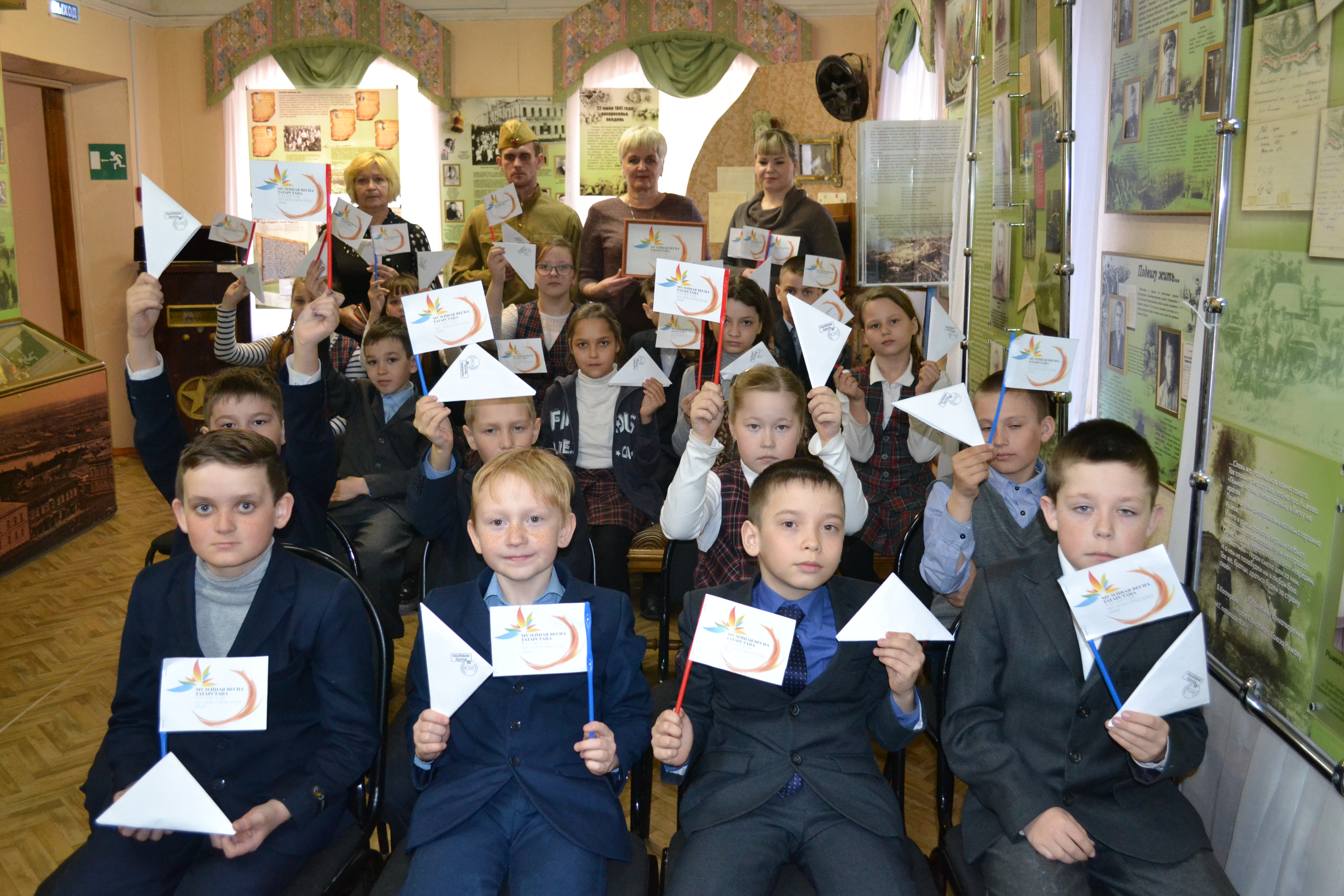 Ребята увидели подлинные фронтовые письма – треугольники, написанные нашими земляками. Среди них были и письма Героя Советского Союза Дряничкина Михаила Ефимовича, адресованные жене и детям. Особенно, детей тронули письма девочки Таты Снегиревой, эвакуированной из Ленинграда в Тетюшский детский дом. Сотрудник музея в солдатской форме научил ребят складывать письма-треугольники.