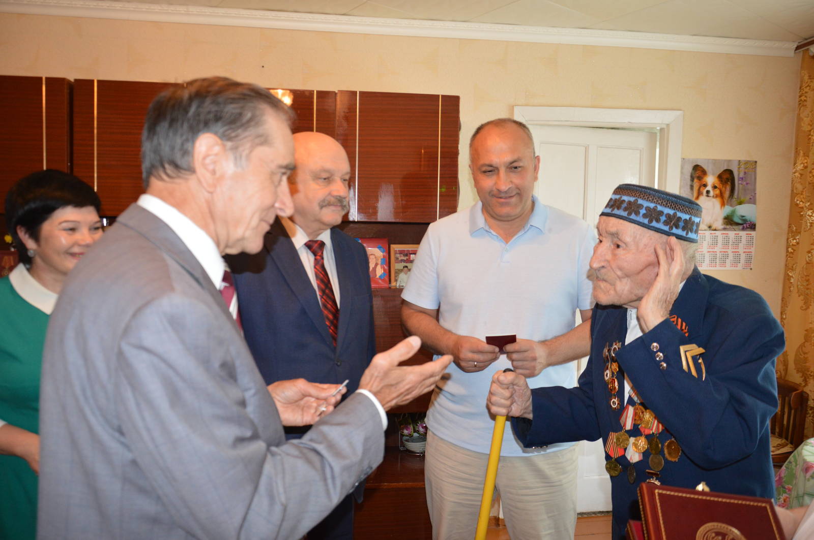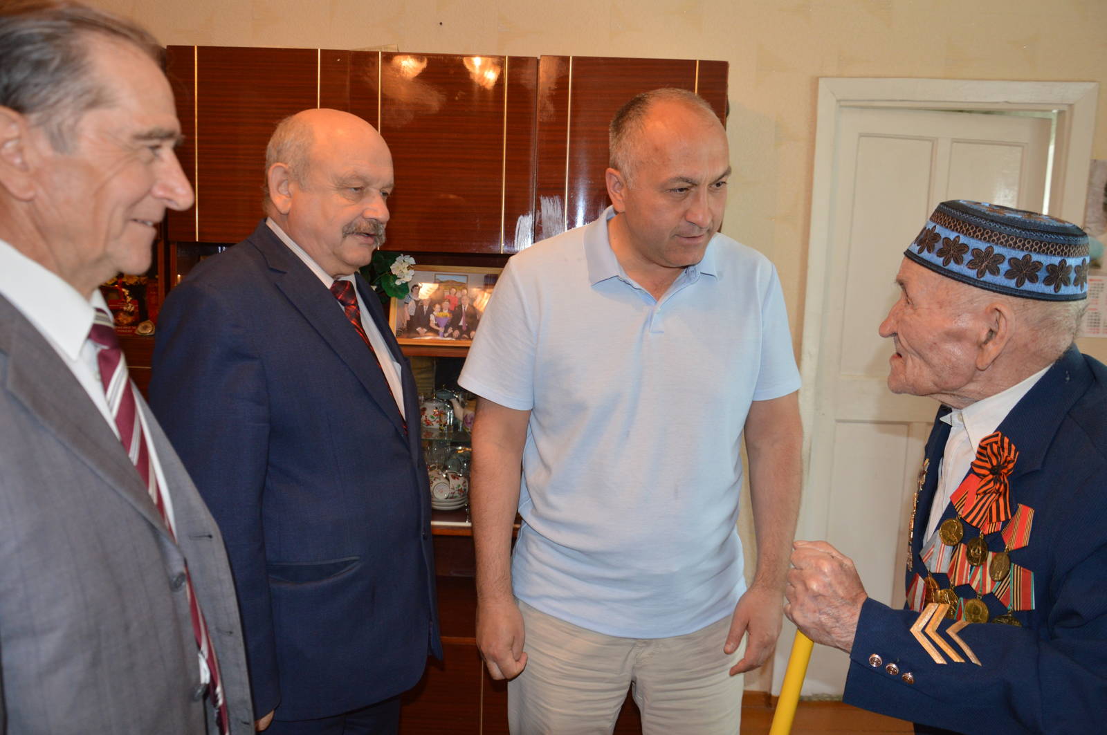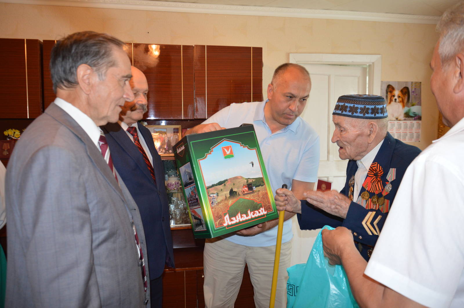 Глава Азнакаевского муниципального района М.З.Шайдуллин, Председатель Республиканского Совета региональной общественной организации ветеранов (пенсионеров) РТ Х.Г.Иштиряков, заместитель руководителя Исполнительного комитета Альметьевского муниципального района В.И.Самойлов, Председатель Совета ветеранов Азнакаевского муниципального района М.И.Каримов торжественно вручили Государственную награду РТ - медаль "За доблестный труд" ветерану Великой отечественной войны Аюпову Гайнулле Гаффазовичу.
