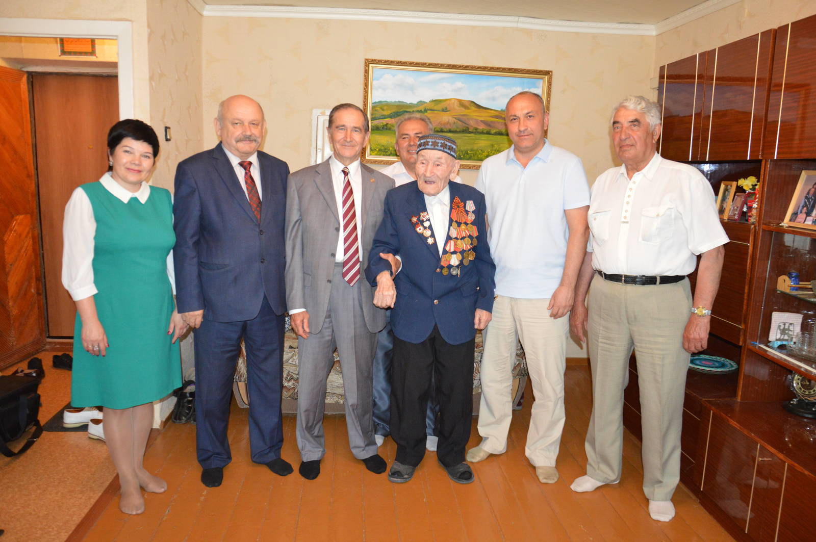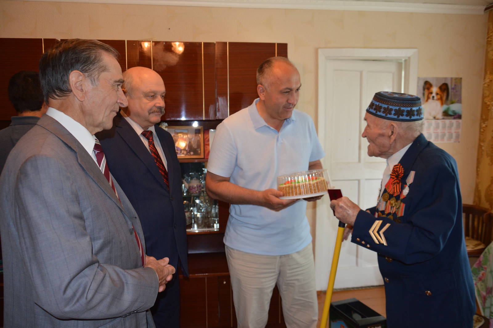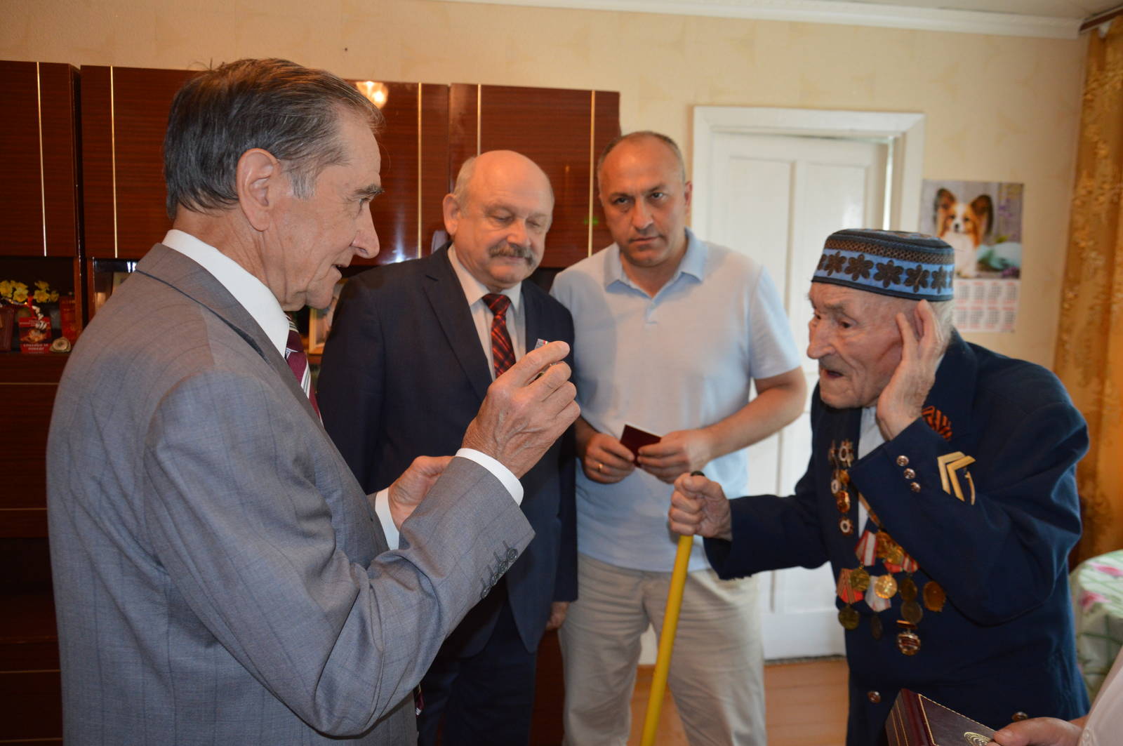 Глава Азнакаевского муниципального района М.З.Шайдуллин, Председатель Республиканского Совета региональной общественной организации ветеранов (пенсионеров) РТ Х.Г.Иштиряков, заместитель руководителя Исполнительного комитета Альметьевского муниципального района В.И.Самойлов, Председатель Совета ветеранов Азнакаевского муниципального района М.И.Каримов торжественно вручили Государственную награду РТ - медаль "За доблестный труд" ветерану Великой отечественной войны Аюпову Гайнулле Гаффазовичу.