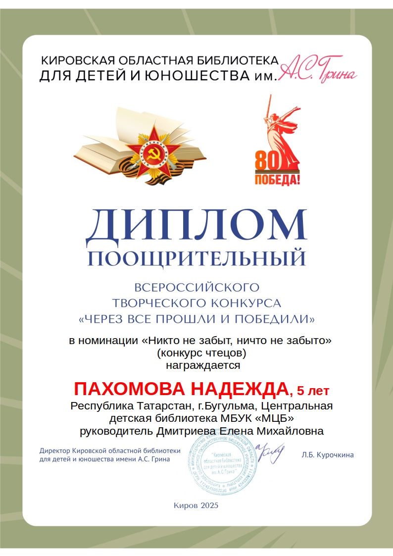 Диплом поощрительный - Пахомова Надежда, 5 лет, Республика Татарстан, г. Бугульма