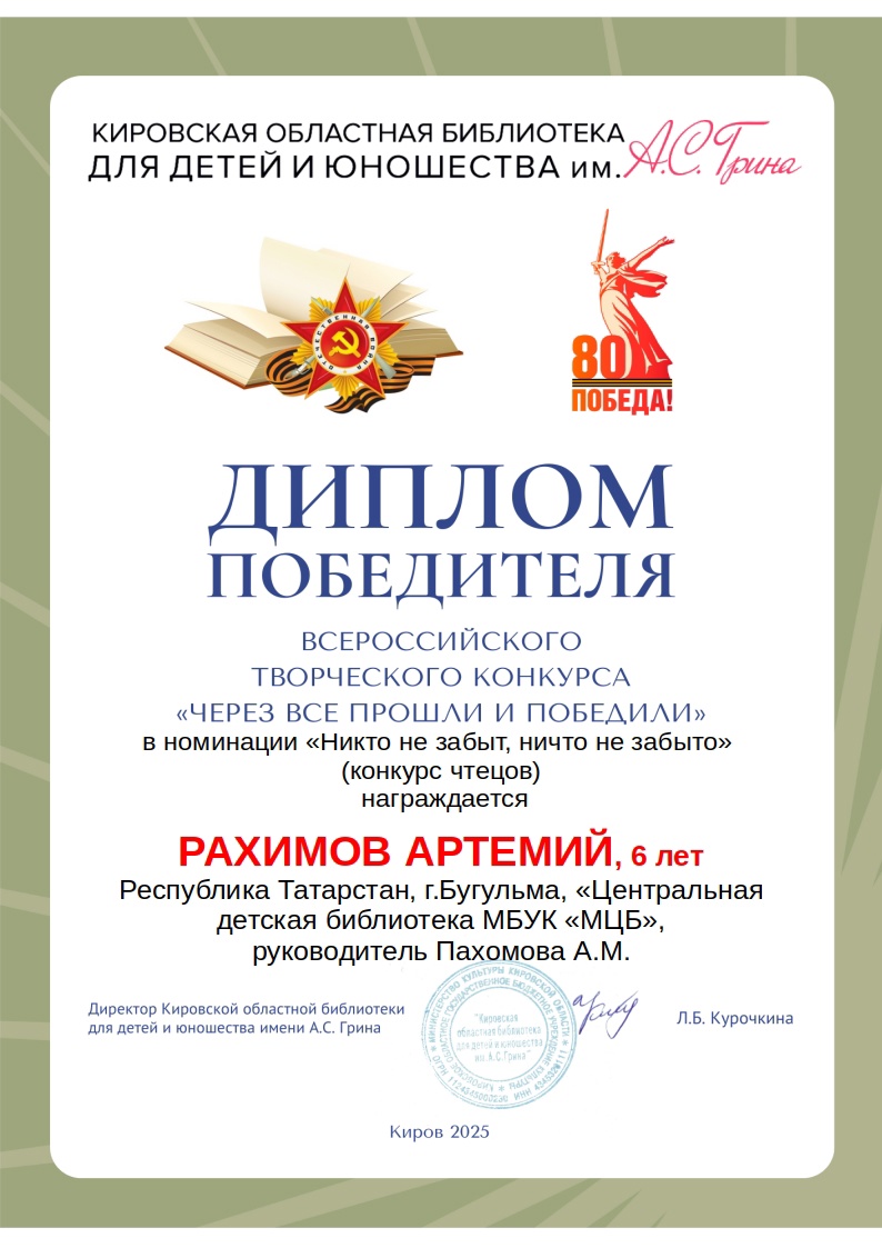 Диплом победителя - Рахимов Артемий, 6 лет, Республика Татарстан, г. Бугульма