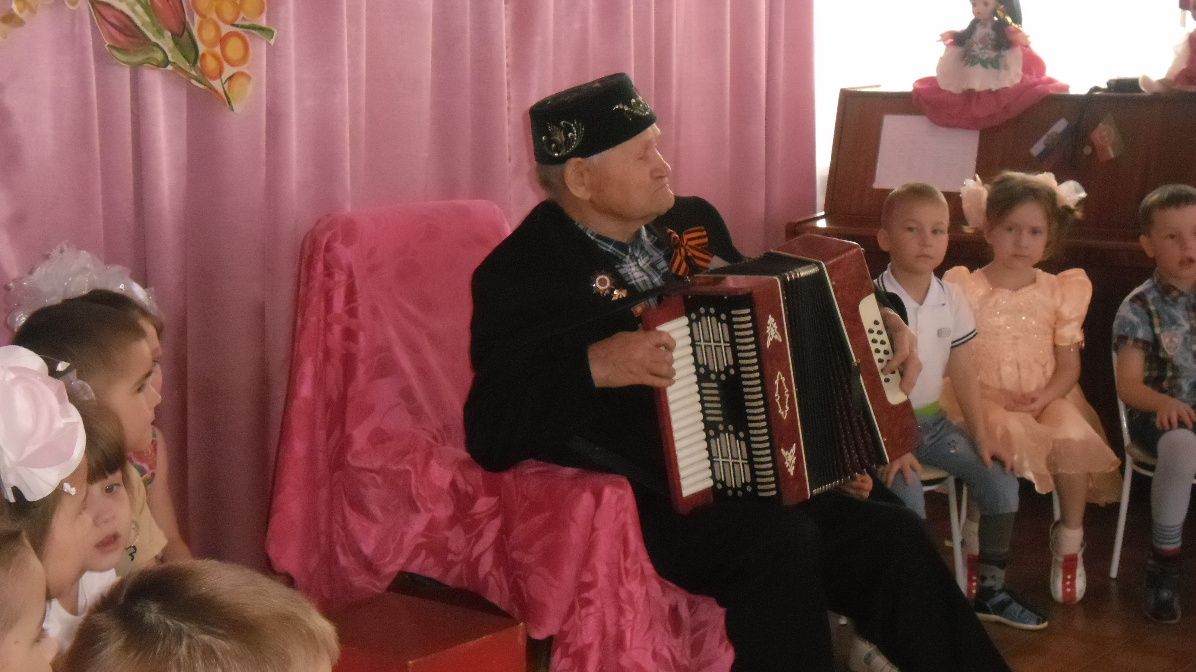 В гостях детского сада "Лилия" побывал ветеран войны Халимов Мисхат Халимович. Он рассказал детям о трудных военных годах, исполнил военные песни. Несмотря на долгие прожитые годы, Мисхат абый с удовольствием играет на гармони. Дети с интересом рассматривали ордена и медали ветерана, задавали вопросы. И на радость ветерану исполнили музыкальные номера.