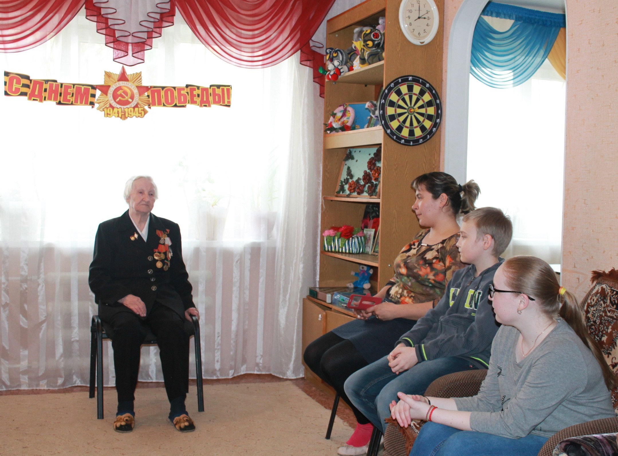 Учащиеся не только с интересом слушали нашего уважаемого ветерана, рассказавшего о военных действиях, о труде женщин и детей в тылу, о том, какие испытания выпали на долю советского народа в годы войны, как, несмотря ни на что, наш народ выстоял и победил; но и подготовили стихотворения о войне и мире, которые прочитали с большим чувством! Ребята поблагодарили ветерана за очень интересный рассказ, поздравили с наступающим праздником Победы и пригласили Ираиду Алексеевну прийти в гости еще раз. Ветерану торжественно вручили цветы.
