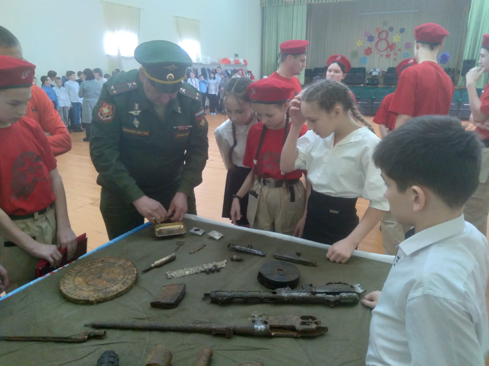 Он привез с собой наглядные выставочные макеты и экспозиции боевых орудий. Евгений Геннадьевич рассказал юнармейцам, что в Альметьевске активно развивается поисковое движение. Отряды «Десант», «Форпост» и «Кадет» выезжают в полевые поисковые экспедиции по местам боевой славы. За последние три года на территории Волгоградской, Ленинградской и Псковской областей проведено 7 экспедиций, по результатам которых найдено 35 останков бойцов Красной Армии.