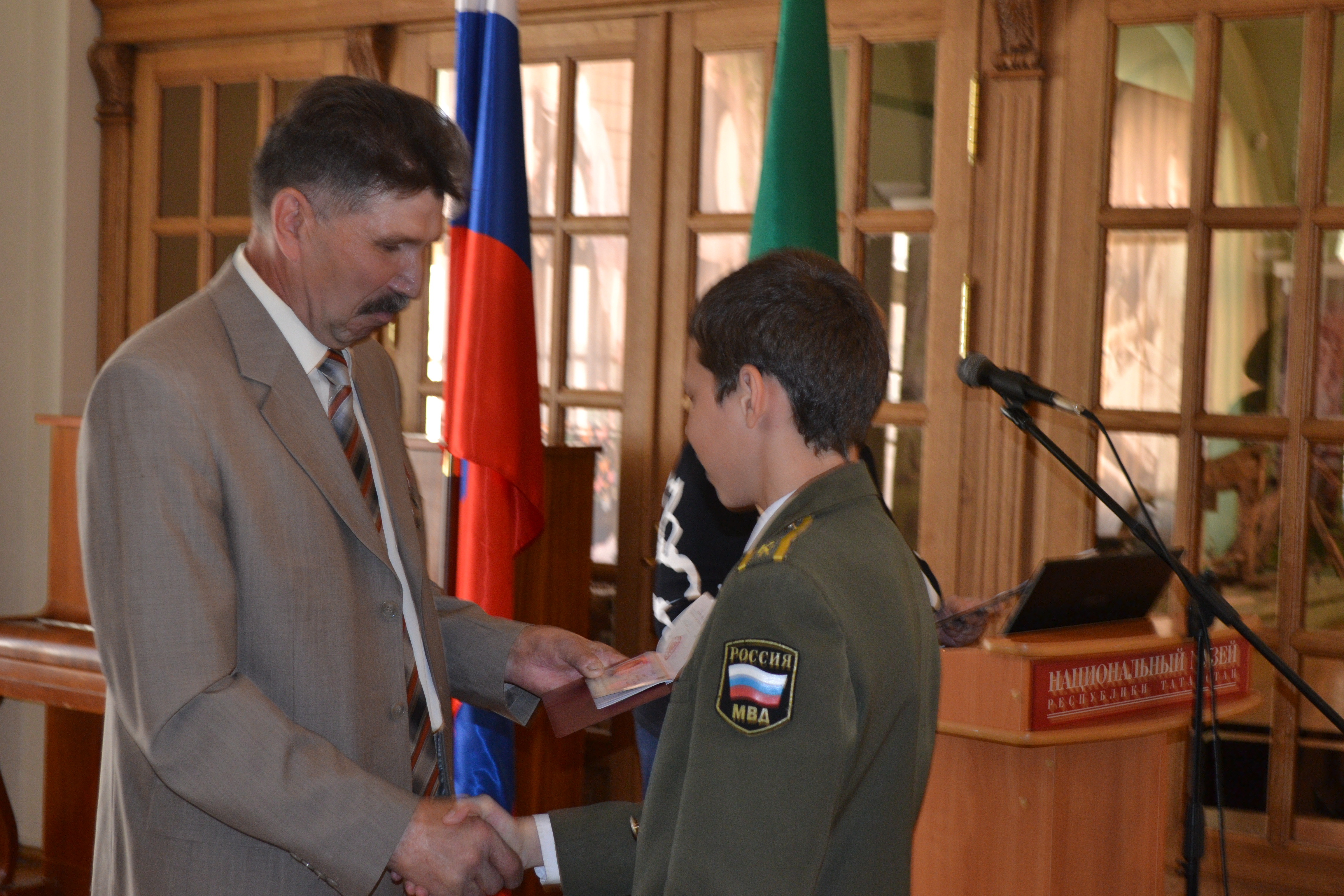 Жители Казани, достигшие 14-ти лет, смогли впервые ощутить себя полноправными гражданами России. Они получили паспорт из рук почётного гостя – Морозова Олега Владимировича – ветерана пожарной охраны МЧС, бывшего начальника пожарной части военного объекта Зеленодольского района, подполковника внутренней службы, Кавалера ордена мужества 2004 года.