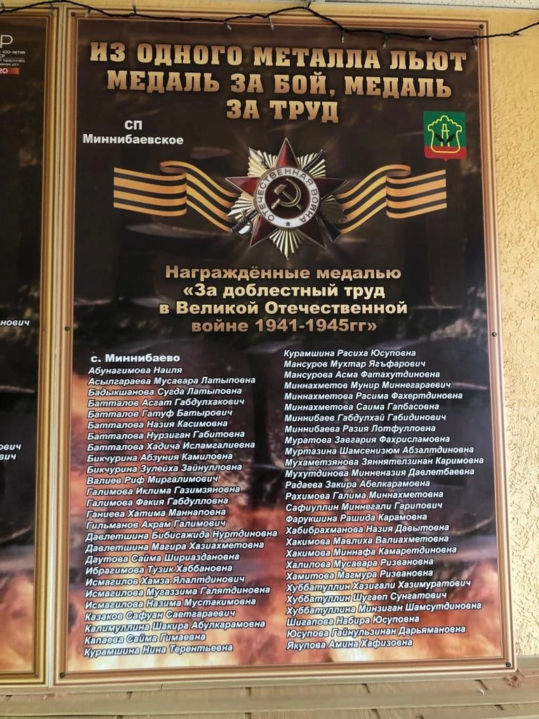 В фойе сельского дома культуры Миннибаевского сельского поселения была организована установка памятного планшета труженикам тыла награжденным медалью "За доблестный труд в Великой Отечественной войне 1941-1945гг.", в рамках программы по увековечиванию памяти о Великой Отечественной войне.