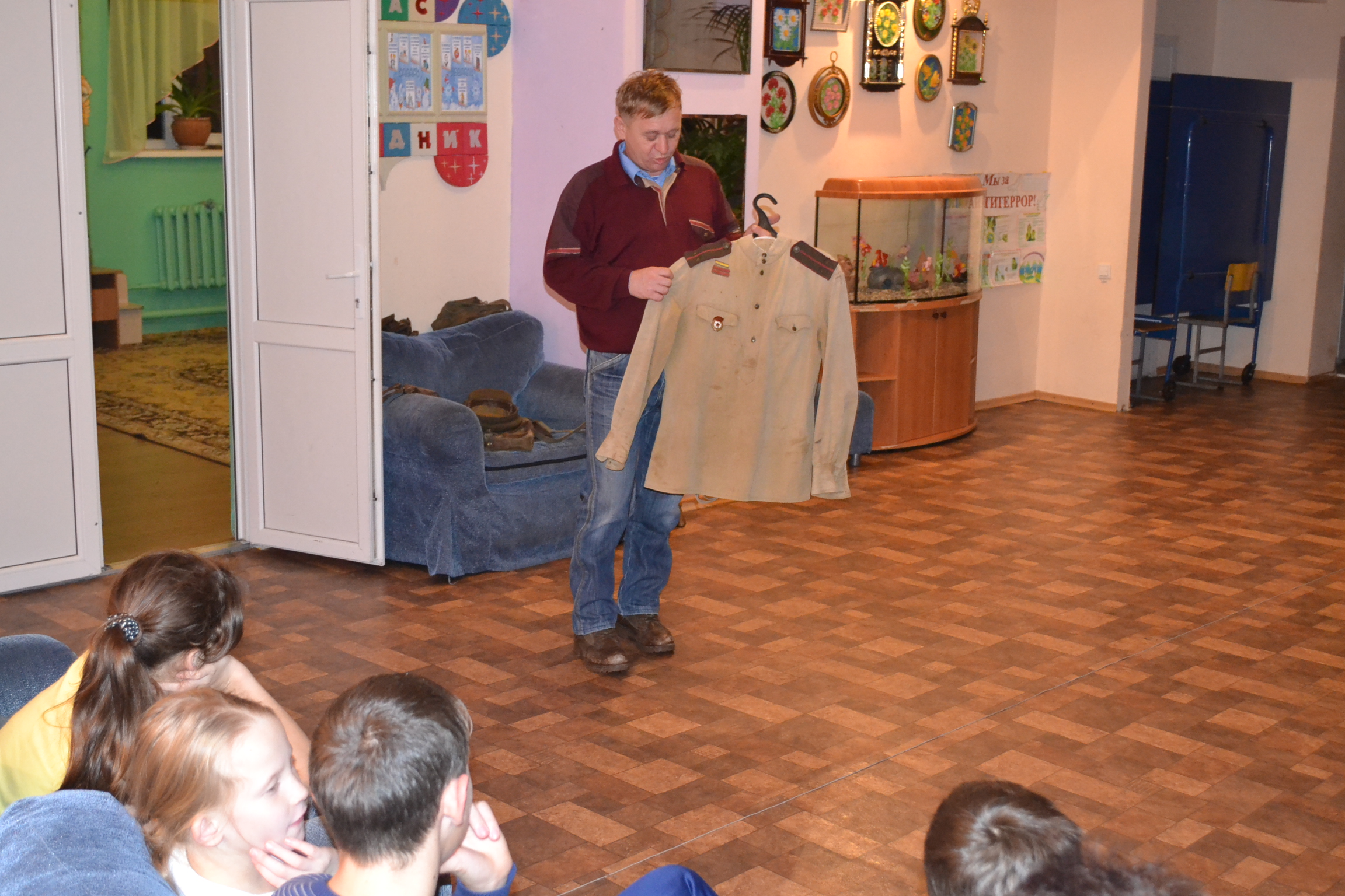 18 января 2017 г. в "Заботе" - пункте временного пребывания детей, оказавшихся в трудной жизненной ситуации, силами участников военно-исторического клуба "Звезда" было проведено познавательное занятие на тему "Форма и снаряжение военнослужащих Красной Армии в годы Великой Отечественной войны". Вниманию детей была представлена летняя форма и снаряжение, а также макеты вооружение пехотинцев периода 1941, 1942 и 1943-1945 гг. Ребята узнали, чем отличалась форма и знаки различия солдат и офицеров КА разного периода, названия разных предметов, таких как - фуражка, пилотка, стальной шлем, гимнастёрка, бриджи, гвардейский значёк, нашивка за ранение и многое другое. В заключение было рассказано и показано, как красноармейцы использовали и носили плащ-палатку. В дальнейшем планируется продолжение такой просветительской работы и новые встречи.