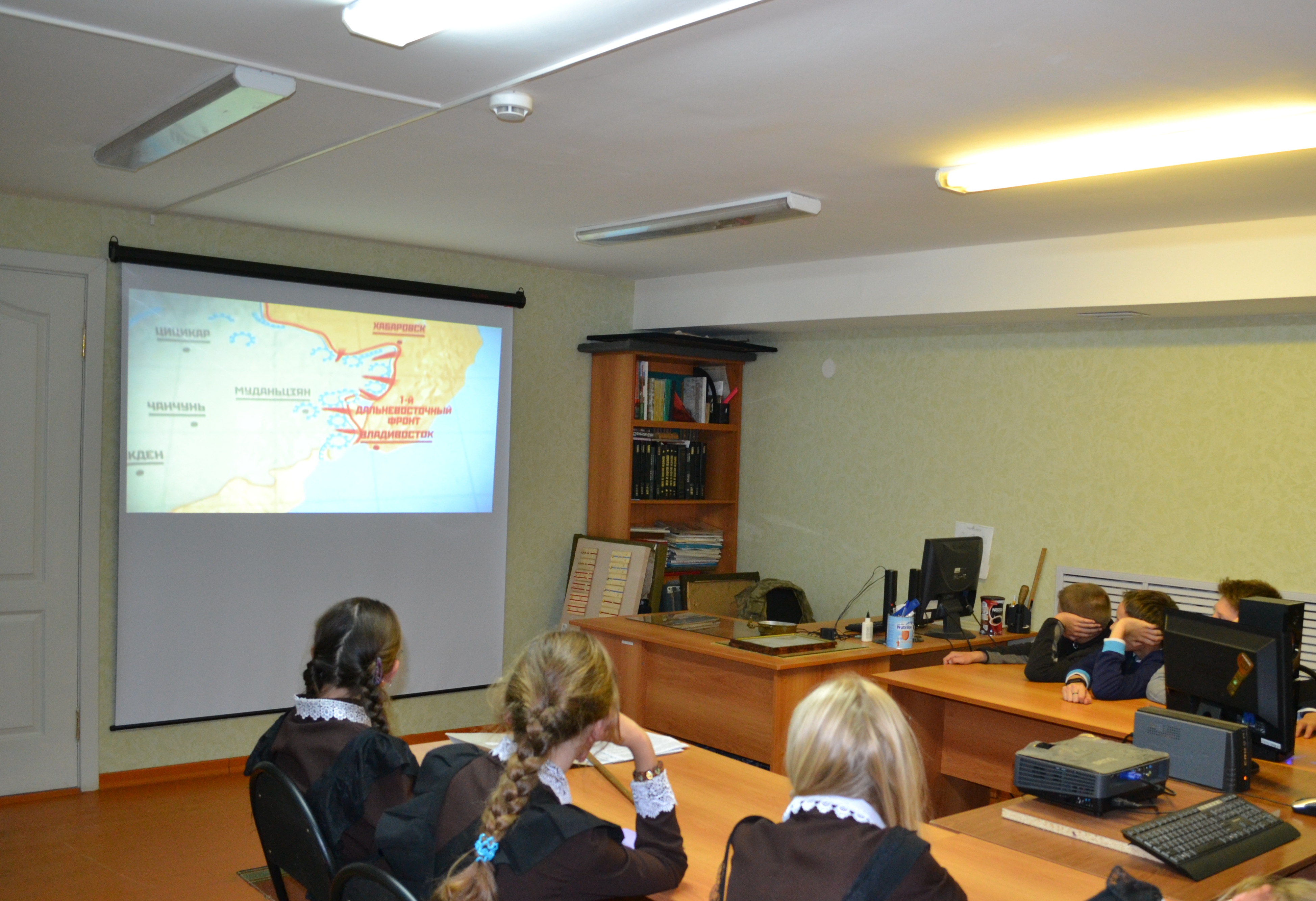 Сегодня 6 октября 2015 г в Музее родного края состоялось первое занятие по музейной программе нового учебного года с группой учащихся 7 класса Алексеевской школы №1 на тему "Завершение Второй мировой. Советско-японская война". Ребятам было рассказано об участии алексеевцев в войне на Дальнем Востоке, их подвигах, были показаны фотографии участников "японской кампании" - уроженцев нашего района, их наградные документы и даже одна настоящая медаль "За победу над Японией". В заключение семиклассники смогли увидеть фрагмент фильма из цикла "Великая война", посвящённый событиям августа 1945 г. в Маньчжурии.