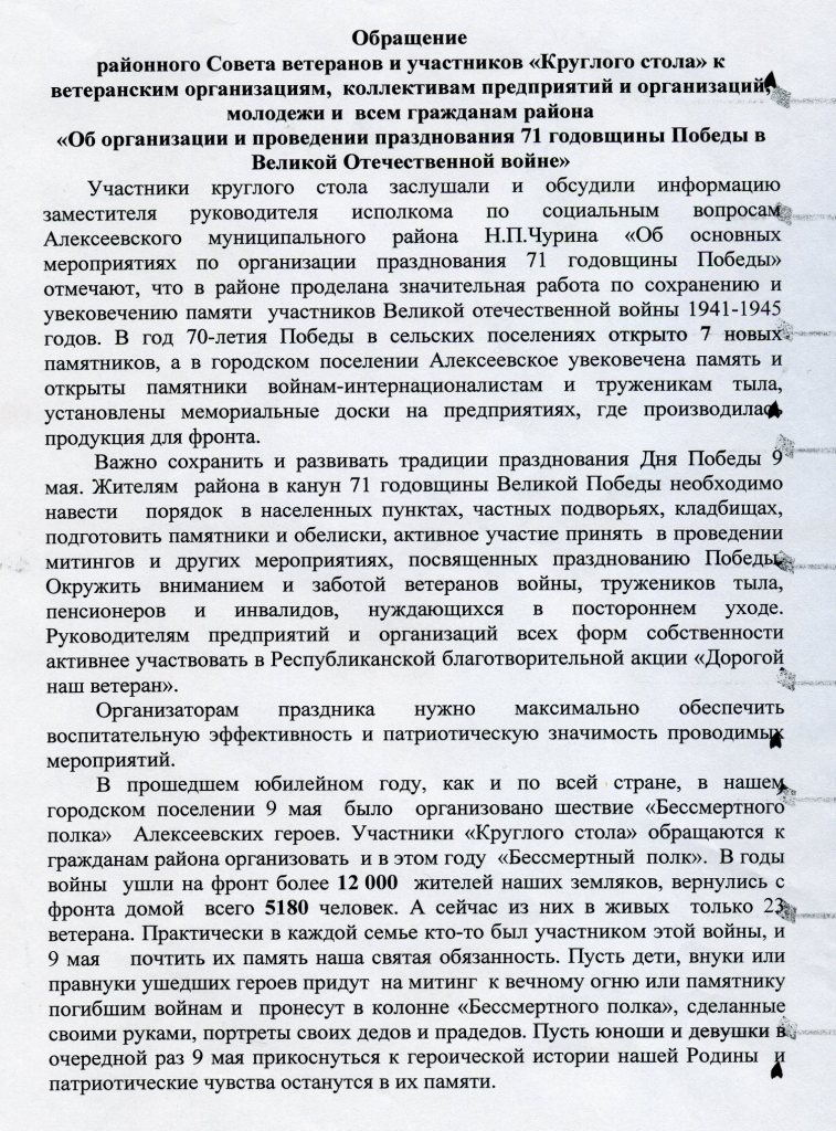 25 марта 2016 г. в здании Алексеевского аграрного колледжа, по инициативе Совета ветеранов, состоялось расширенное заседание "Круглого стола" по животрепещущим вопросам, касающихся празднования 71 - й годовщины Великой Победы. На заседании присутствовали, помимо руководства и активистов Совета ветеранов, заместитель рук. ИК по соц. вопросам Н.П. Чурин, руководители школ райцентра, военный комиссар, представители бизнеса, Совета ветеранов Афганистана и Чечни, отделов молодёжи, культуры, представитель прессы, другие представители общественности. Зам. рук. ИК озвучил, какие конкретные задачи ставятся перед районом и всеми его службами по празднованию Дня Победы в контексте распоряжений руководства Республики и ИК, представил районный план проведения праздника. В частности, была озвучена задача, чтобы для ветеранов войны и приравненных к ним катергоий очередная годовщина стала никак не хуже юбилейной даты. Были озвучены проблемы и недостатки, выявленные исходя из опыта проведения предыдущих торжеств 9 мая. Особенно живо и остро обсуждался вопрос о проведении акции "Бессмертный полк", а также воспитательное воздействие на молодёжь в ходе всего тожества вцелом. Затрагивалась также тема работы корпункта "Виртуального музея Великой Отечественной войны" и доработки списков для издания Книги Памяти "Герои тыла" по Алексеевскому району. В ходе заседания любой желающий мог высказать свои предложения и доводы, и таких было немало. По итогам "Круглого стола" было принято обращение к ветеранским и молодёжным организациям, всем гражданам района "Об организации и проведении празднования 71 годовщины Победы в Великой Отечественной войне", которое будет опубликовано в СМИ. Подобные заседания было решено проводить регулярно.