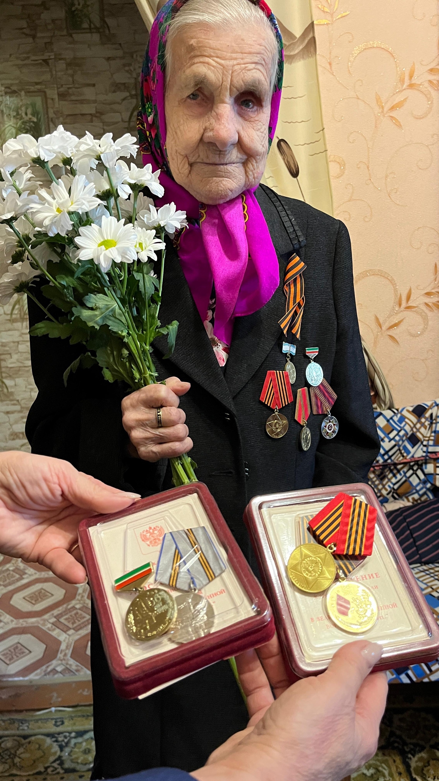 Пиджак именинницы увешан медалями. Есть среди них - «За доблестный труд во время Великой Отечественной войны» и «Мать-героиня».
