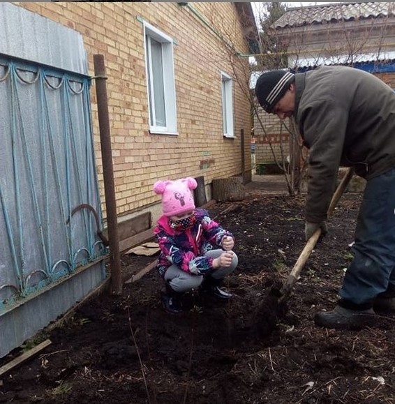 Школьники вместе с родителями сажают молодые деревья на приусадебных участках