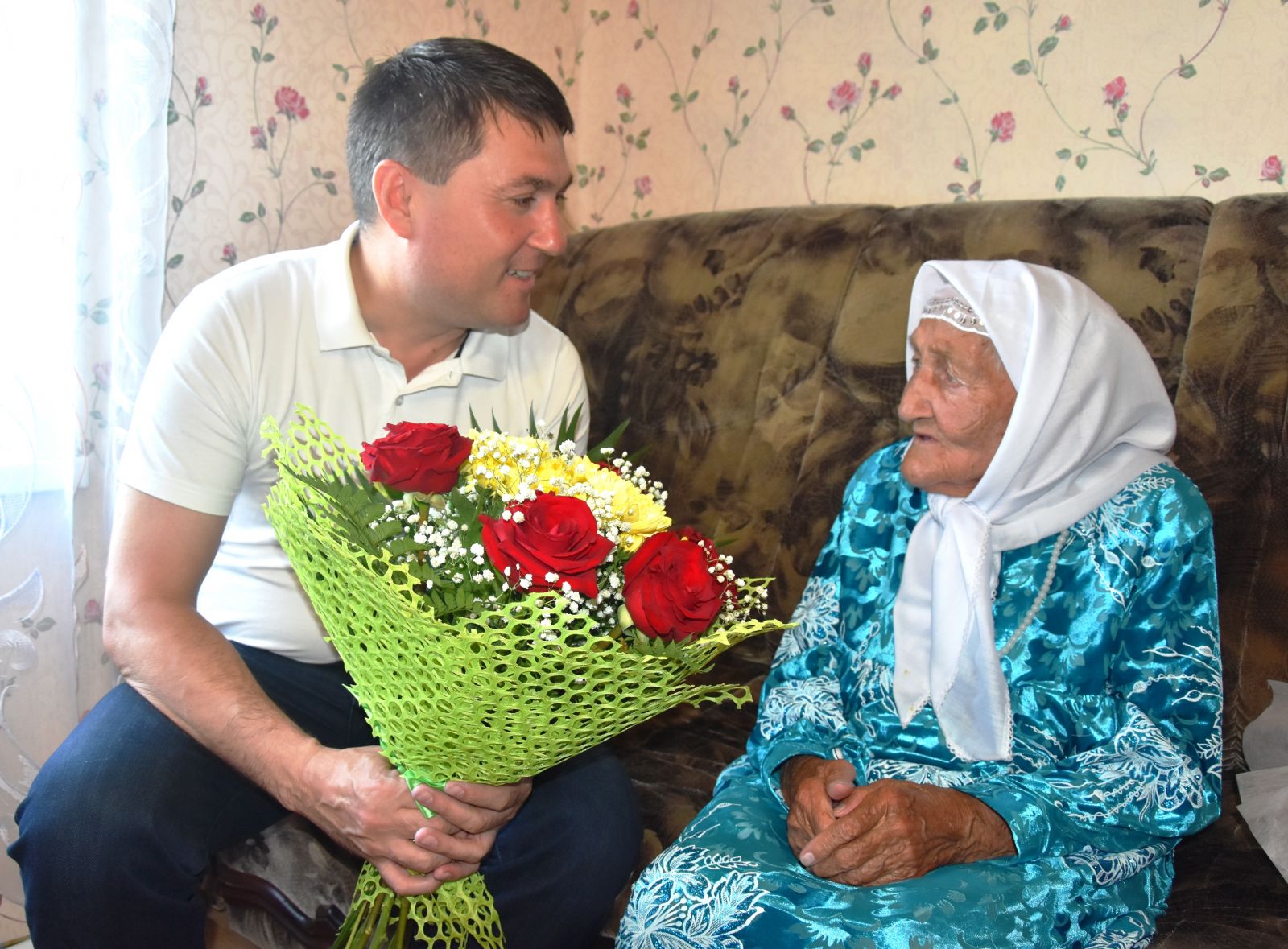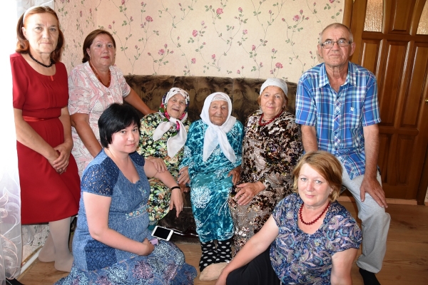 Поздравить ее с этой замечательной датой приехал глава муниципального района Равиль Кузюров. Он вручил юбилярше Поздравительные письма Президентов России и Татарстана, поздравил от своего имени, передал подарки.Я совершенно не ожидала увидеть бабушку, которая вышла из соседней комнаты твердыми шагами. Разве не удивительно, что ровесница века не нуждается в посторонней помощи, ходит на своих ногах?! Порозовевшие щеки, одухотворенное лицо словно у молодой здоровой девушки. Бабушка отчетливо помнит свой жизненный путь, поминает в молитвах односельчан, давно ушедших из жизни. Бибигамбар эби очень довольна сегодняшней жизнью.Начиная распутывать клубок ее столетней жизни, пролетевшей подобно ветру, видишь, что она прошла нелегкий путь. С мужем Гусман абый жили счастливо, родили 12 детей. Трудолюбивые родители всех восмерых детей подняли на ноги, постарались всем дать образование. Дети тоже не огорчают бабушку, справляются о состоянии матери, всегда помогают. У Бибигамбар эби 7 детей, 21 внук, 34 правнук, 14 праправнуков. Самой старшой дочери 82 года, а младшей - 60 лет. Сегодня бабушка живет в отчем доме в семье младшей дочери Гульсины.Зрение не подводит и слышит хорошо. Еще может вдеть нитку в иголку и читает книги. До сих пор не любит сидеть без дела. Еще два-три года назад находила себя какое-то занятие. Любит вспоминать песни своей молодости. Гостеприимно привечает приезжающих внуков, правнуков, – рассказывает дочь про маму.