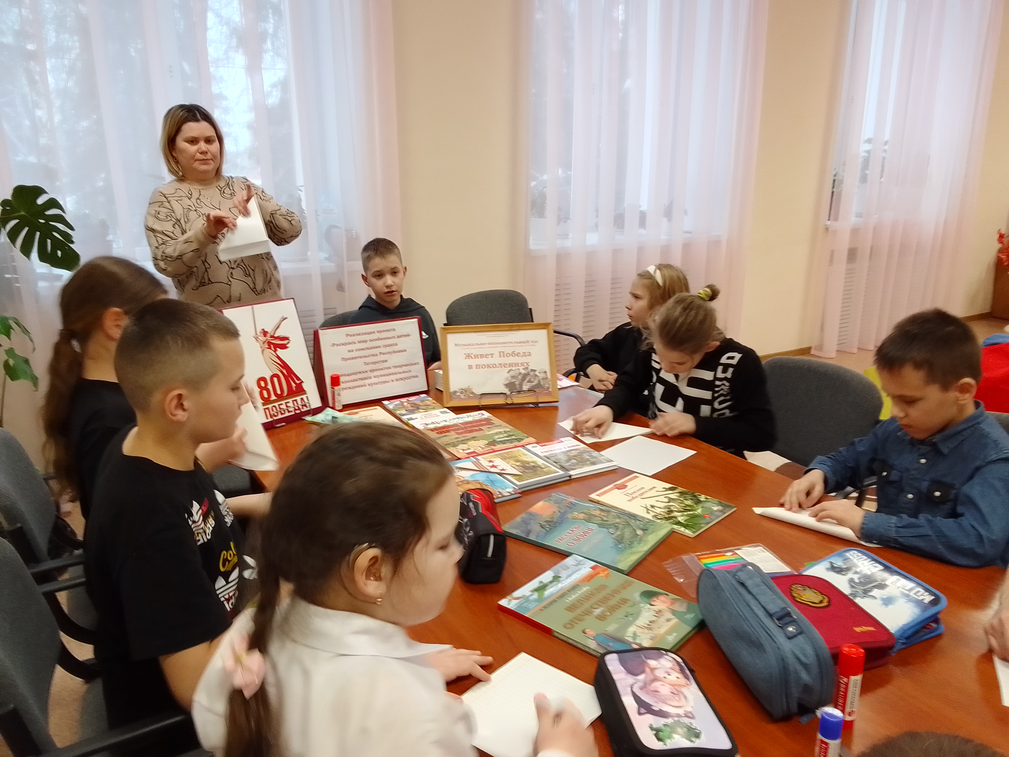 В рамках реализации проекта «Раскрась мир особенных детей» сотрудники библиотеки-филиала №5 г. Бугульма провели для читателей ГБОУ «Бугульминская школа-интернат для детей с ограниченными возможностями здоровья» музыкально-познавательный час «Живет Победа в поколениях». С помощью воспитателя-сурдопереводчика библиотекарь ознакомила присутствующих с понятиями «фронтовое письмо» и «военная почта», рассказала, как ждали сложенные бумажные треугольники на фронте и в тылу, и как по письмам можно отследить военный путь солдата, напомнила, что во многих семьях хранятся пожелтевшие от времени послания, а внуки-правнуки с трепетом их перечитывают. В заключение мероприятия ребята приняли участие в мастер-классе по изготовлению письма-треугольника и ознакомились с литературой, представленной на книжной выставке «Строка к строке о той войне»: о значимых исторических битвах, военной технике, полководцах и флотоводцах.