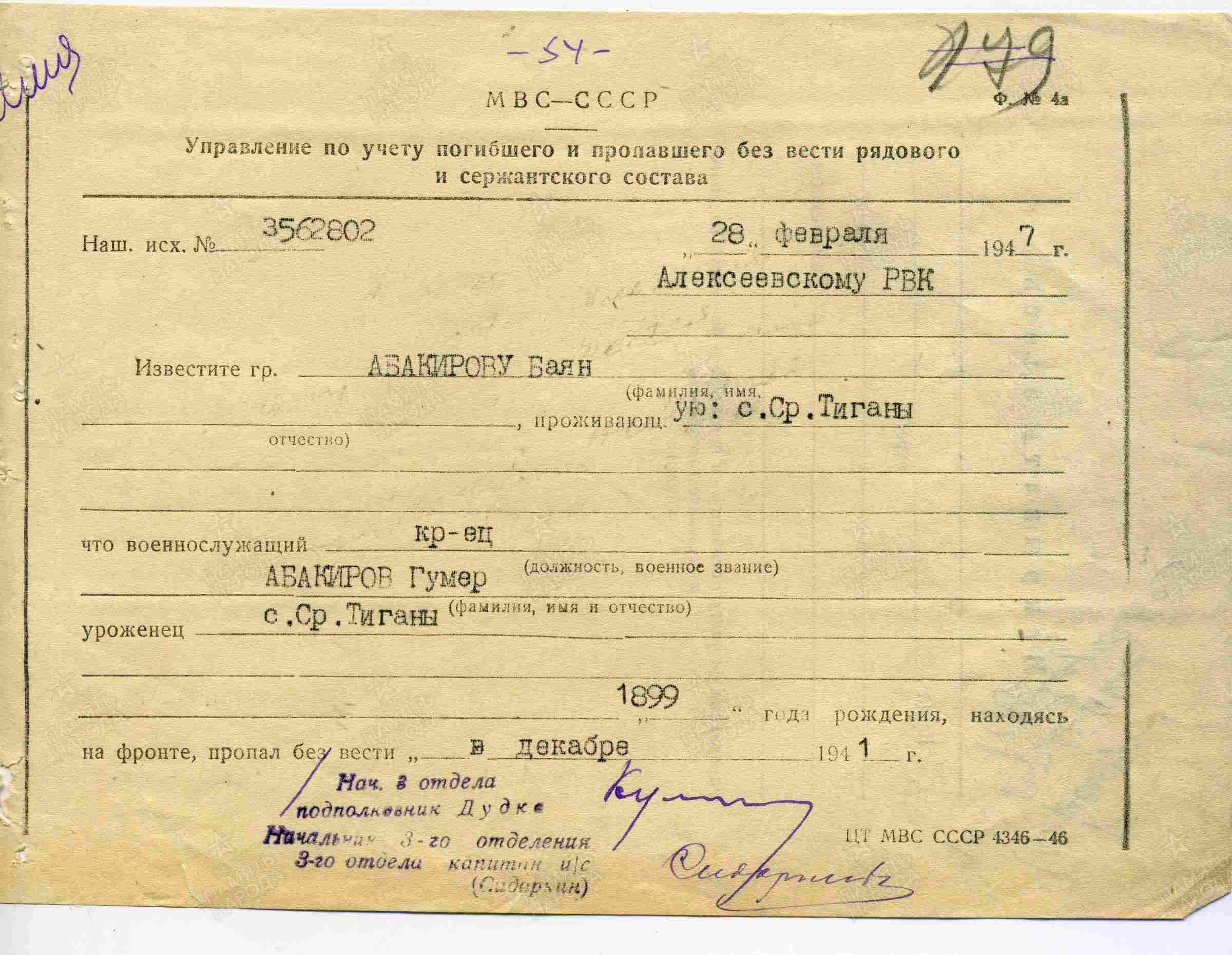 АБАКИРОВ (АБУБАКИРОВ) Гумер, 1899 (1900), с. Нижние Тиганы. Мобилизован Алексеевским РВК в 1941. Красноармеец, миномётчик 366 отд. пулемётно-артиллерийского батальона 27 А Северо-Западного фронта. Убит в бою 15 марта 1943, д. Брагино, Старо-Русский р-н, Новгородская обл.