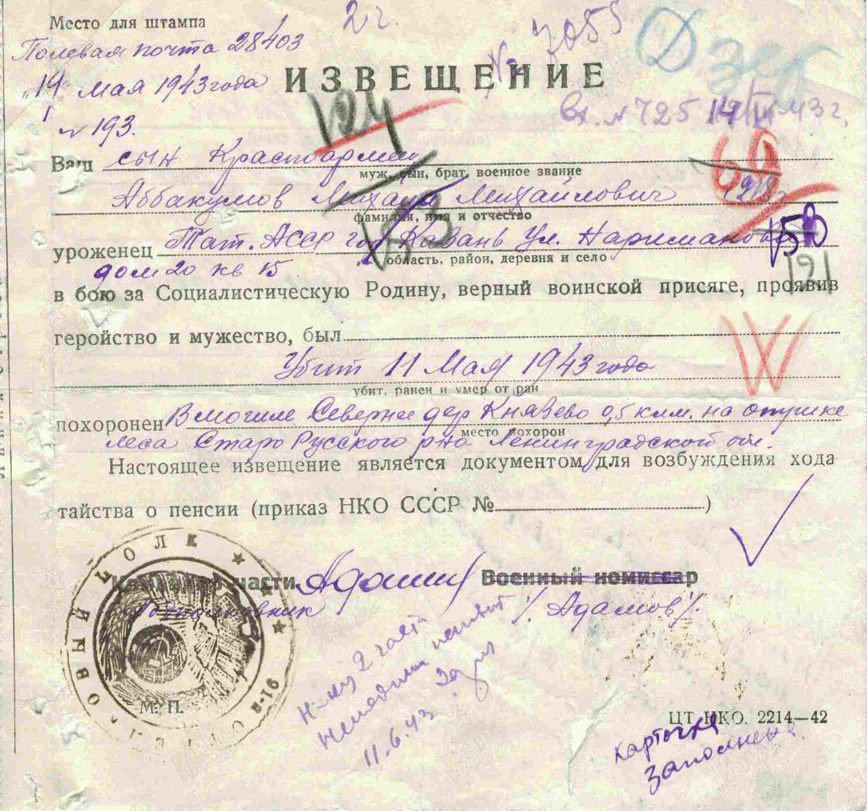 АБАКУМОВ Михаил Михайлович, 1918, с. Левашево. Мобилизован Беломорским РВК Карело-Финской ССР 16 янв. 1942. Красноармеец, телефонист взвода связи 91 СП 37 СД Северо-Западного фронта. Награждён медалью «За боевые заслуги». Убит 11 мая 1943, д. Князево, Старорусский р-н, Новгородская обл. Увековечен в г. Ст. Русса (д. Стариково).