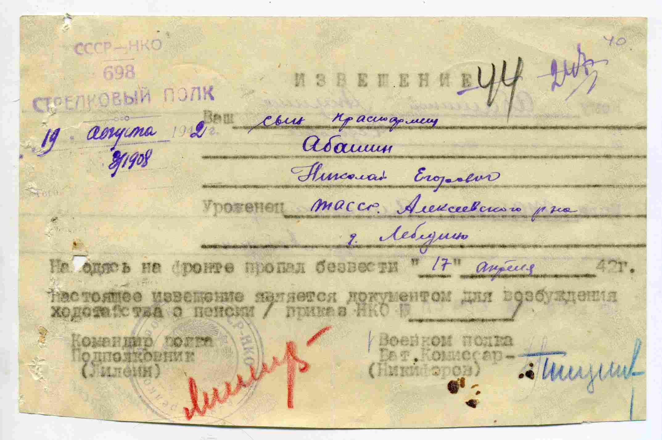 АБАШИН Николай Егорович, 1921, с. Лебедино. Мобилизован Алексеевским РВК 29 дек. 1941. Красноармеец, стрелок 698 СП 146 СД 50 А ЗапФ. В боях за д. Фомино Барятинского р-на Калужской обл., в апр. 1942 был тяжело ранен. Учтён по потерям как пропавший без вести. Проходил лечение в ЭГ 3100, п. Дегтярка Свердловской обл.