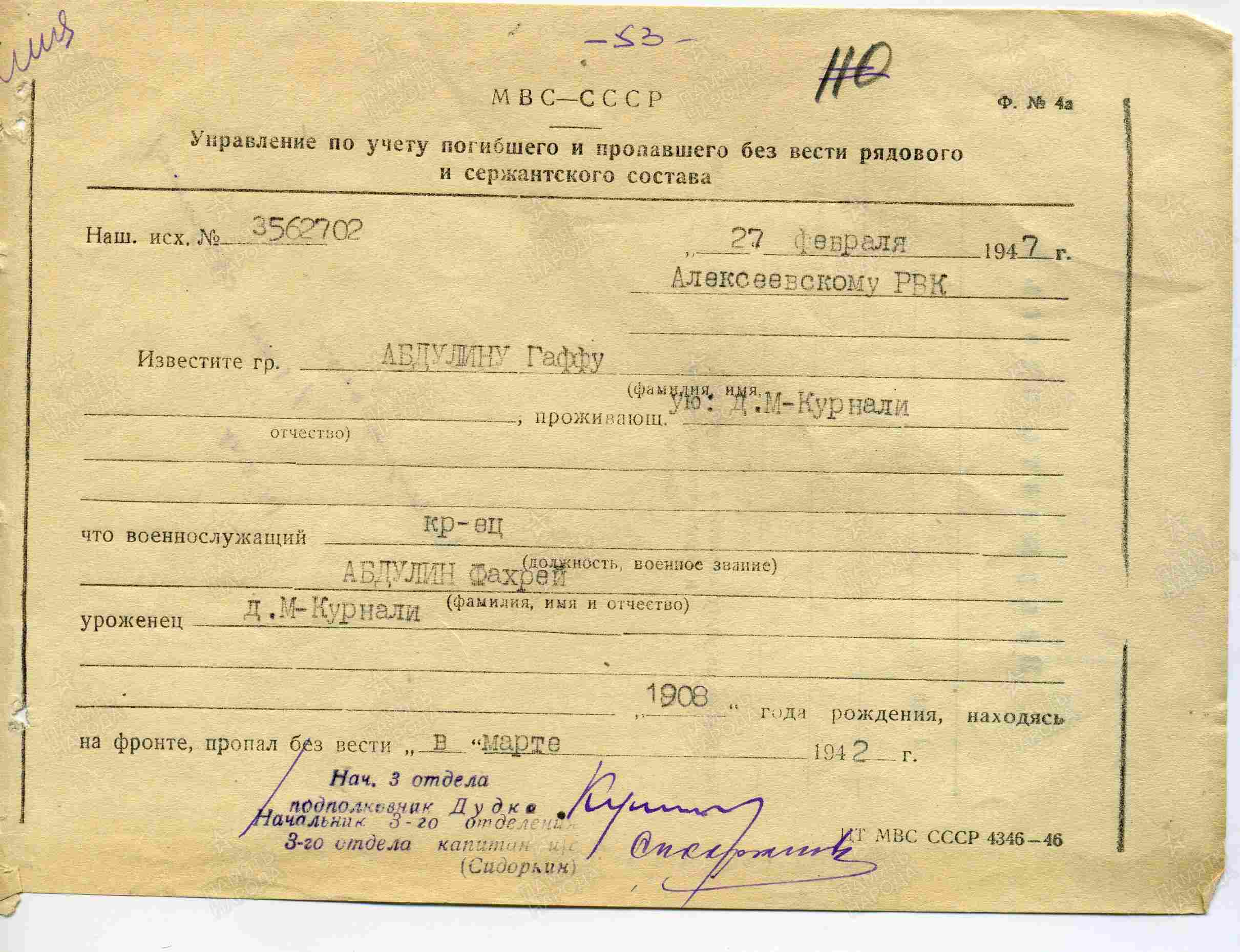 АБДУЛЛИН Фахрей, 1908, м. Мокрые Курнали. Мобилизован Алексеевским РВК в 1941. Красноармеец. Пропал без вести на фронте.