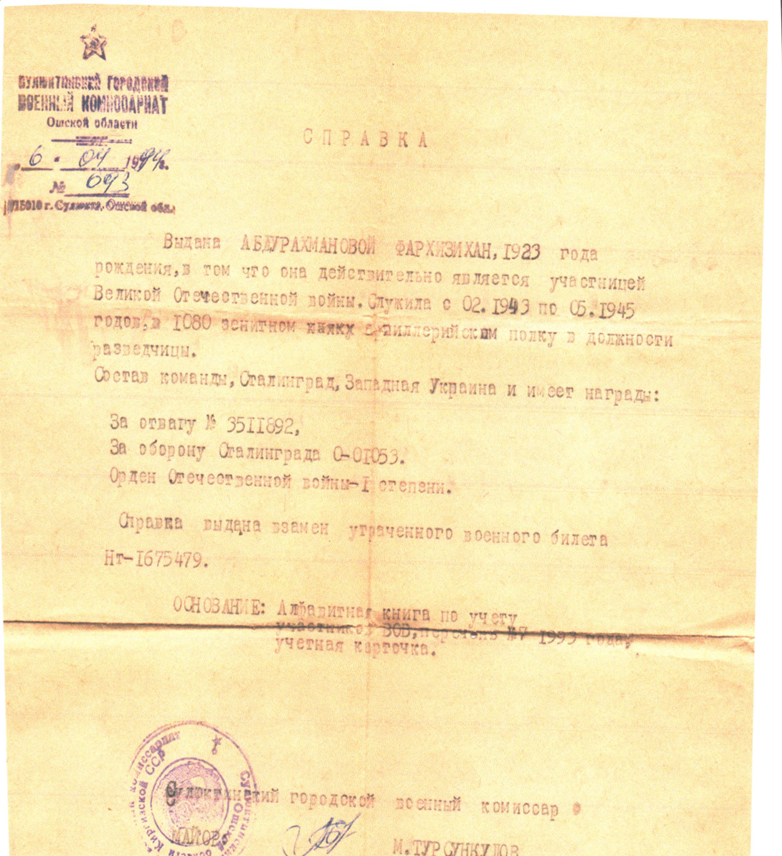 Абдурахманова Фархизихан Вахитовна родилась 5 марта 1923 года в деревне Дурт-Мунча Заинского района. В шахтерский город Сулюкта в Киргизии она попала в 1936 году после скоропостижной смерти родителей от тифа. Из родной деревни вместе с сестрой в поисках работы увезла с собой на жительство в Среднюю Азию. С тринадцати лет до самой войны Фархизихан работала на шахте отборщиком породы: ворочала лопатой на конвейере каменный уголь. На первом этапе ее военный жизни были тысячи кубометров земли при рытье противотанковых рвов, солдатских окопов, возведении защитных укреплений. Затем Фархизихан отправляют на фронт. Она в должности разведчика 1080 зенитно - артиллерийского полка засекает воздушные и наземные огневые точки немцев. Ее «боевое крещение» состоялось под Сталинградом, и в действующей армии она – до самой Победы. От тяжелого ранения в голову у нее остался шрам на затылке. За участие в боях Родина наградила ее орденом Отечественной войны I-степени и медалями: «За отвагу», «За Оборону Сталинграда» и юбилейными - после войны. Воюя, Фархизихан ещё не знала, что на полях сражений также проливает кровь ее земляк и будущий муж, тоже доброволец, старшина разведроты Арслан Абдурахманов. Конечно, она встречала его до войны на улицах Сулюкты, но близко познакомилась с ним по возвращение домой 1947 году. Мирная жизнь обоих продолжилась на шахте, где она опять встала за транспортерную ленту, а он – в забой. Прожив с ним в согласии 30 лет и воспитав двух дочерей и троих сыновей, Фархизихан похоронила мужа в 1977 году – сказались годы плена и фронтовые ранения. Наконец, в 1993 году состоялось «великое переселение» их большой, уже разрастающейся в четвертым поколением семьи в Татарстан. Фархизихан Вахитовна стала проживать в деревне Горшково Новошешминского района, вместе с младшим сыном Рауфом в большом доме и в окружение других детей, а также внуков и правнуков. 15 ноября 2016 года Фархизихан Вахитовны не стало. Похоронена в Заинском районе, д. Дурт-мунча.