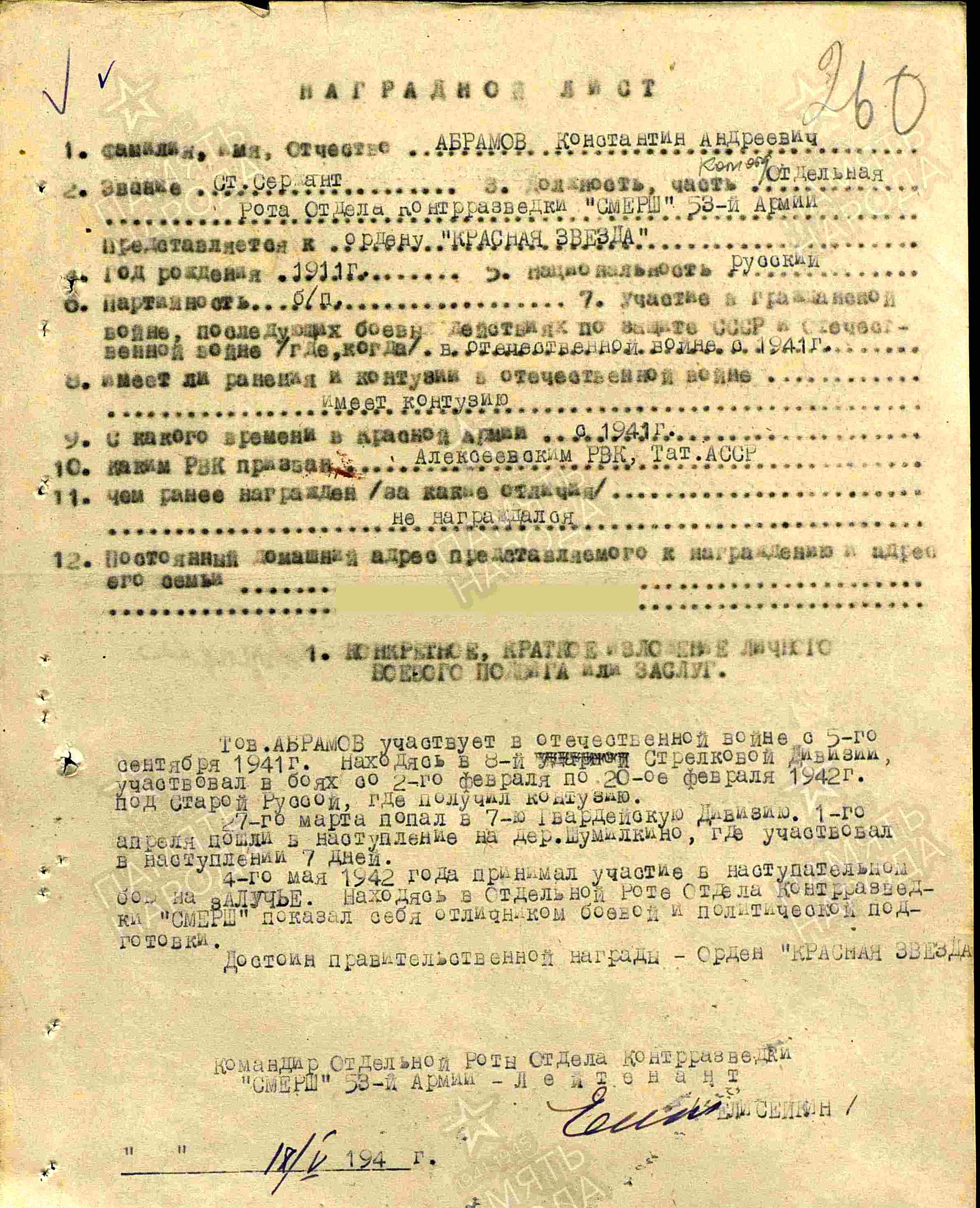 АБРАМОВ Константин Андреевич (Андриянович), 1911, с. Шиловка Симбирской губ. Жил в с. Сахаровка и с. Алексеевское. Мобилизован Алексеевским РВК 5 сент. 1941. Воевал в составе 8 гв. СД и 7 гв. СД Северо-Западного и Калининского фронта. В фев. 1942 был контужен. В 1943 - ст. сержант/старшина, ком. отделения Отдела контрразведки «СМЕРШ» 53 А. Награждён орденом Красной Звезды. Демобилизован в окт. 1945.