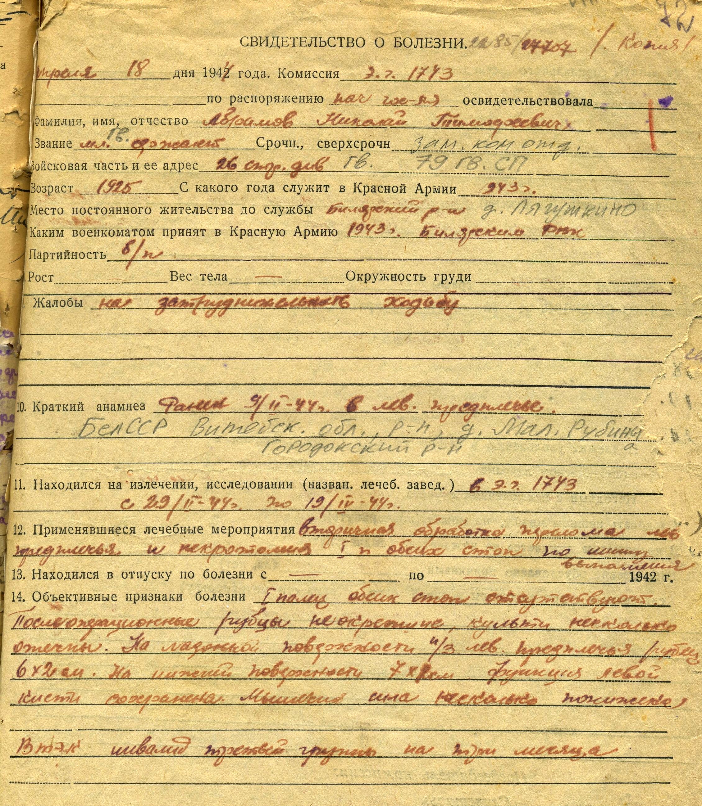 АБРАМОВ Николай Тимофеевич, 1925, с. Лягушкино. До призыва в армию работал в к-зе "Нацмен". Мобилизован Билярским РВК 7 янв. 1943 г. Гв. мл. сержант, зам. ком отделения 79 гв. СП 26 гв. СД 8 гв. СК 11 гв. А 1 Прибалт. фронт. 9 февраля 1944 г. в бою у д. Мал. Рубина(ы) Городокского (Витебского) р-на Витебской обл. БелССР был ранен в левое предплечье с переломом костей, отморозил первые пальцы на обеих стопах (некротомия). По отчёту о потерях 26 гв. СД ошибочно учтён погибшим и похороненным в братской могиле. С 29 февраля 1944 проходил лечение в ЭГ 1743 (г. Павлово, Горьк. обл.). С 18 апреля 1944 признан инвалидом 3 группы на 6 месяцев.