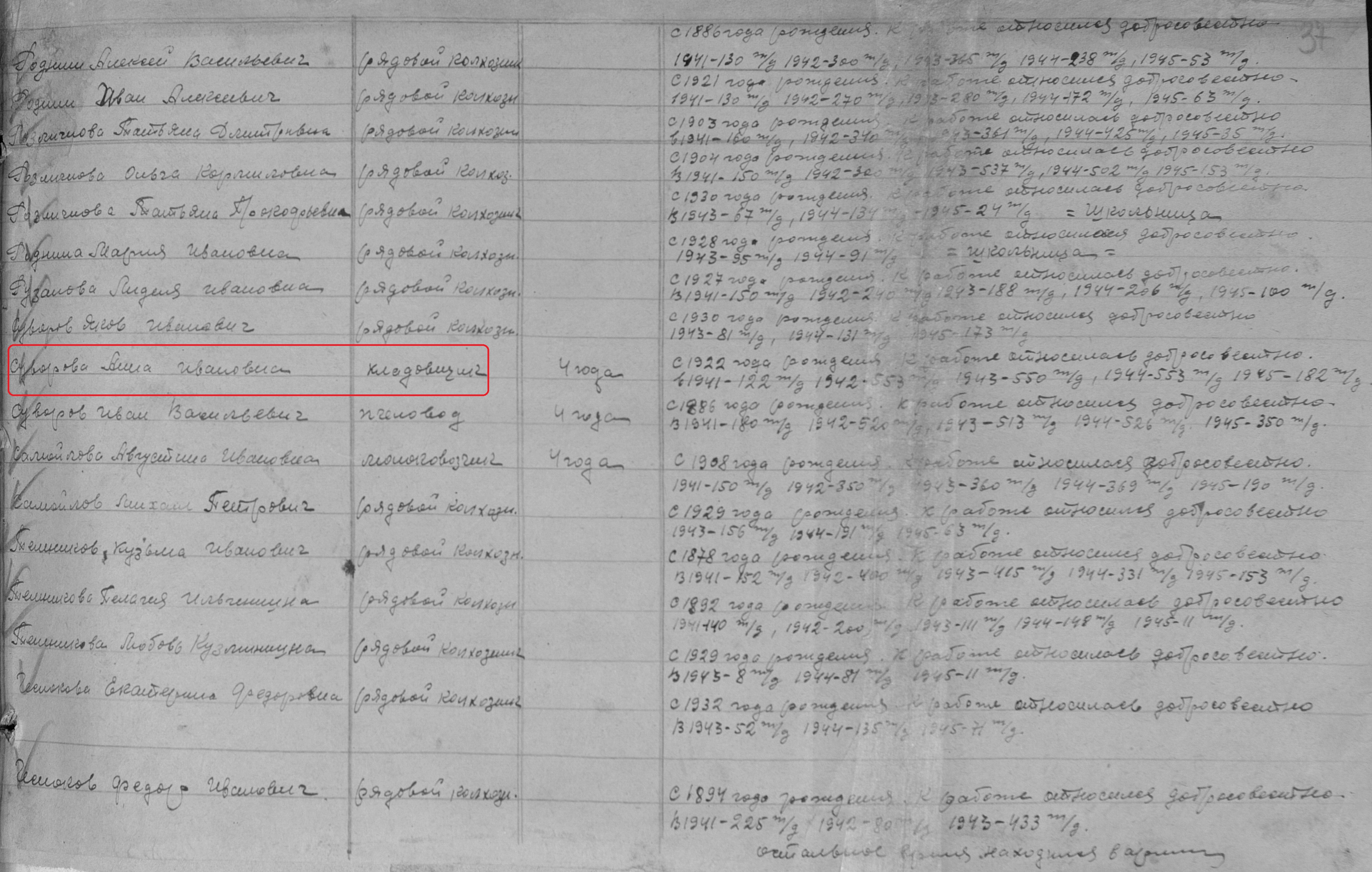 Абражеева (Суворова) Анна Ивановна родилась в 1922 году. Место жительства: п. Елховка Ново-Шешминский район ТАССР. В годы Великой Отечественной войны работала в колхозе им. Ворошилова кладовщицей. Награждена медалью "За доблестный труд в Великой Отечественной войне 1941–1945 гг." (Акт от 28 апреля 1947 г, фонд 3610, опись 2, дело № 325, лист 37). Выбыла в 70-х годах.