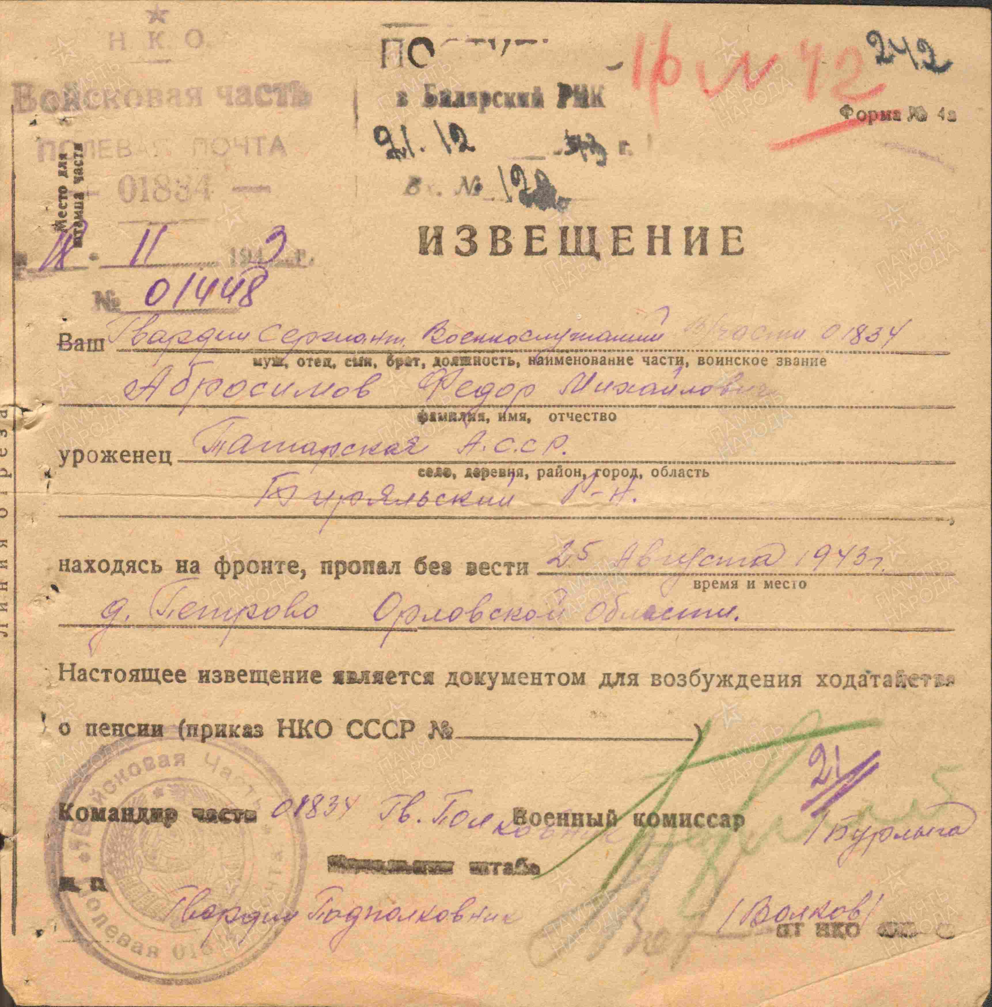 АБРОСИМОВ Фёдор Михайлович, 1918, д. Николаевский Баран. Мобилизован Билярским РВК в сент. 1942. Гв. сержант, 10 гв. танковый полк 11 гв. А. Пропал без вести 25 авг. 1943 в р-не д. Петрово, Орловская обл.