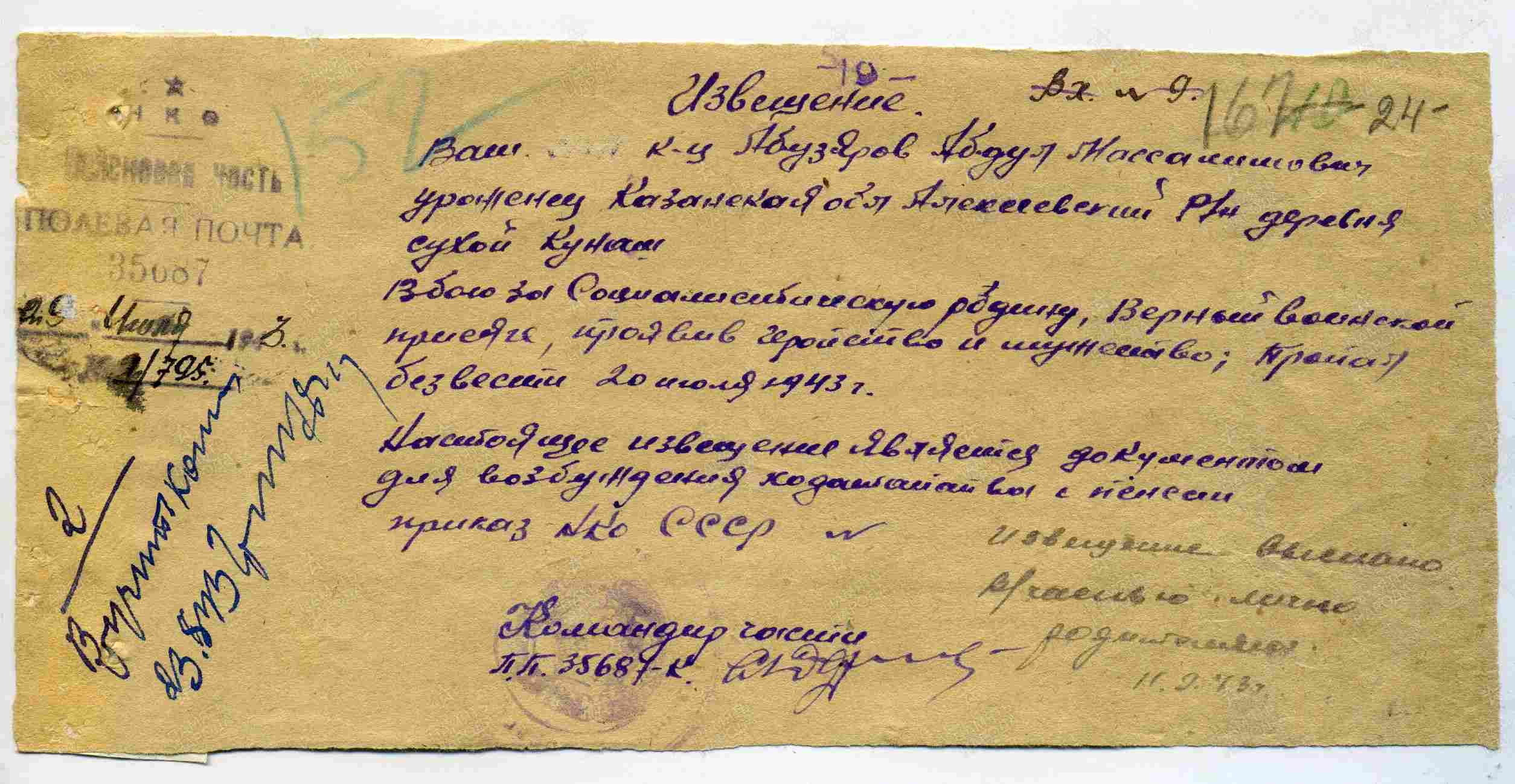 АБУЗЯРОВ Абдулла (Абдул) Мусалимович, 1923, с. Сухие Курнали. Мобилизован Алексеевским РВК 25 сент. 1941. Член ВЛКСМ. Красноармеец, телефонист роты управления 56 мотострелковой бригады 23 ТК 1 гв. А Юго-Западного фронта. Пропал без вести 20 июля 1943, Изюмский р-н, Харьковская обл. УССР.