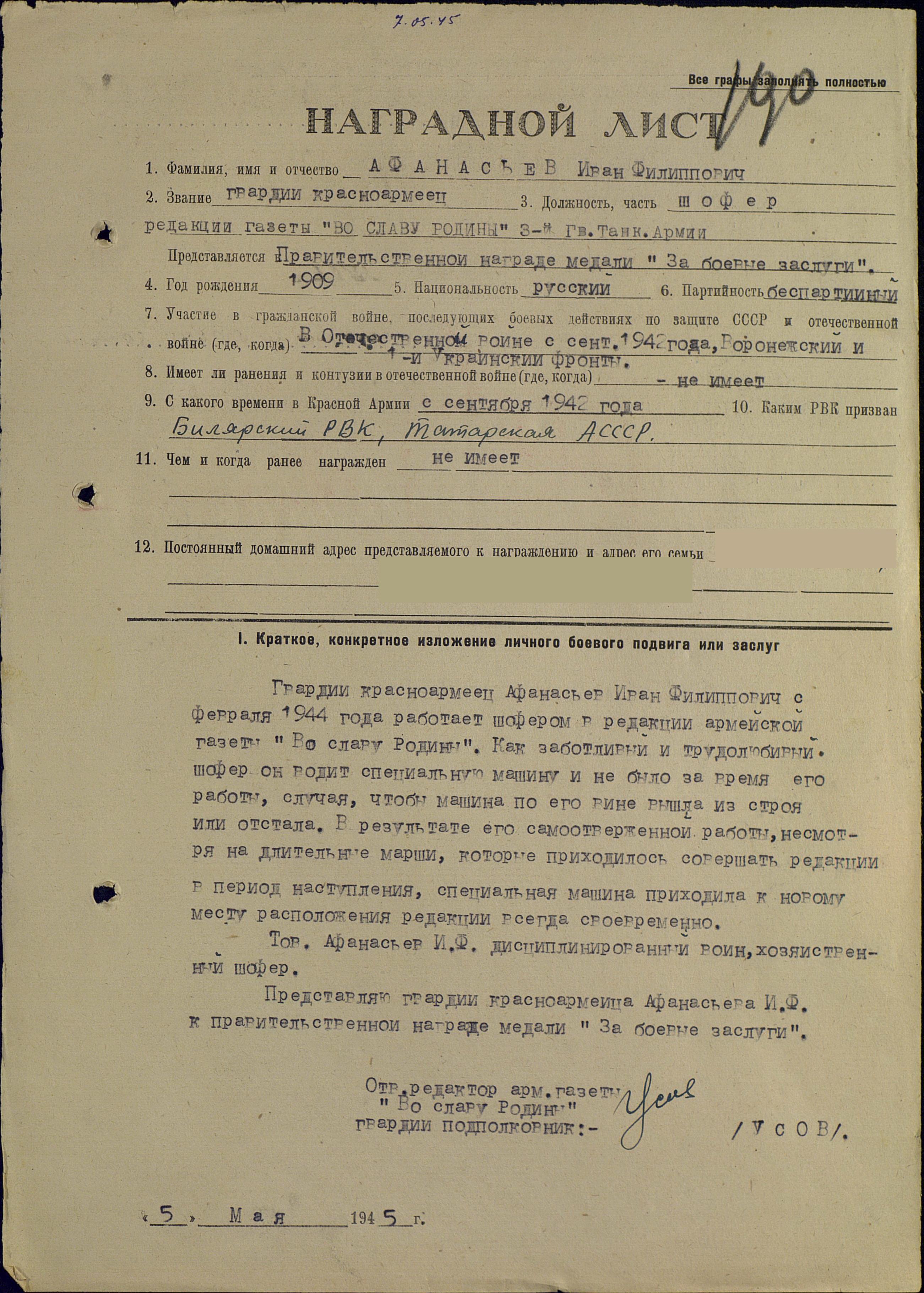 АФАНАСЬЕВ Иван Филиппович, 1909, с. Большие Полянки. Мобилизован Билярским РВК в 1942 . Гв. красноармеец, военный шофёр. Воевал на Воронежском и 1 Укр. фронтах. С фев. 1944 служил шофёром спецмашины редакции армейской газеты "Во славу Родины" 3 гв. ТА. Награждён медалью "За боевые заслуги". После демобилизации работал водителем и мастером наладчиком Большеполянской МТС. Скончался в 1976.