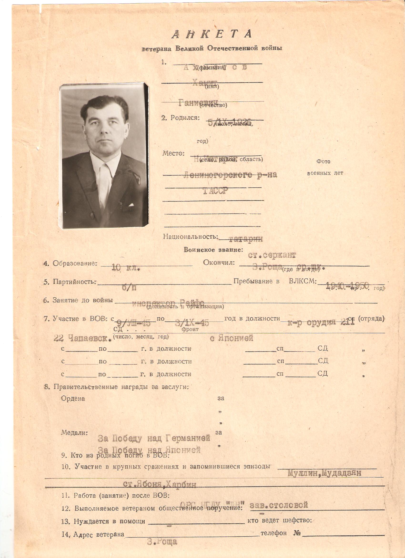 Родился 5.09.1926 г в с. Новый Иштеряк, Лениногорский район РТ. До войны инспектор РайФО.