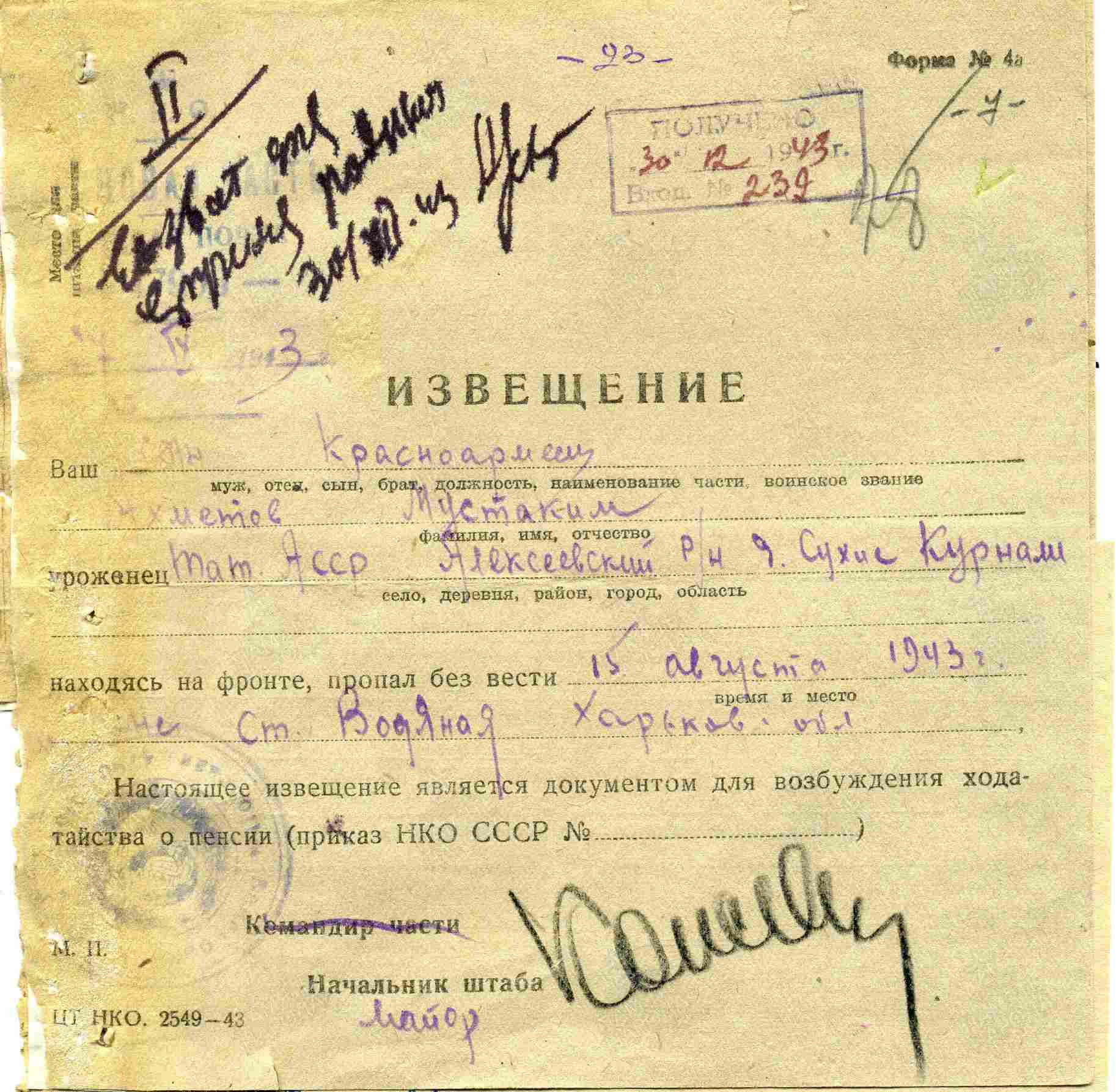 АХМЕТОВ Мустаким Юнусович, 1903, с. Сухие Куранли. Мобилизован Алексеевским РВК. Красноармеец. Пропал без вести 15 авг. 1943, у ст. Водяная, Харьковская обл., УкрССР. По данным ГА РТ - попал в плен и был освобождён.