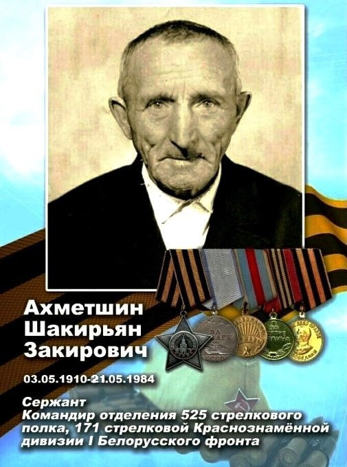 Ахметшин Шакирян Закирович родился в одном из красивейших уголков Башкирии, в Чекмагушевском районе Балтасинского сельсовета, в деревне Каран. С начала войны он был призван по мобилизации в 385 стрелковый полк – стрелком.В июле 1944 года и в октябре 1944 года получил тяжелые сквозные пулевые ранения в брюшную область живота. От предложения остаться в тылу он категорически отказался. И в декабре 1944 года его направили в 525 стрелковый полк командиром стрелкового отделения по ноябрь 1945 года. В марте 1945 года получил сквозное пулевое ранение коленного сустава.