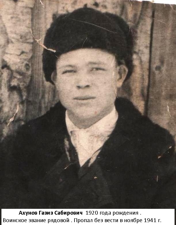 Родился в 1920 г., рабочий поселок Бондюжский Татарской АССР. Мобилизован Бондюжским районным военкоматом 08.12.1940 г. В команде призывников направлен в 15 мотомехбригаду, г.Львов. Пропал без вести в ноябре 1941 г. Отец Ахунов Сабир, жил на Гунина, 10-6.