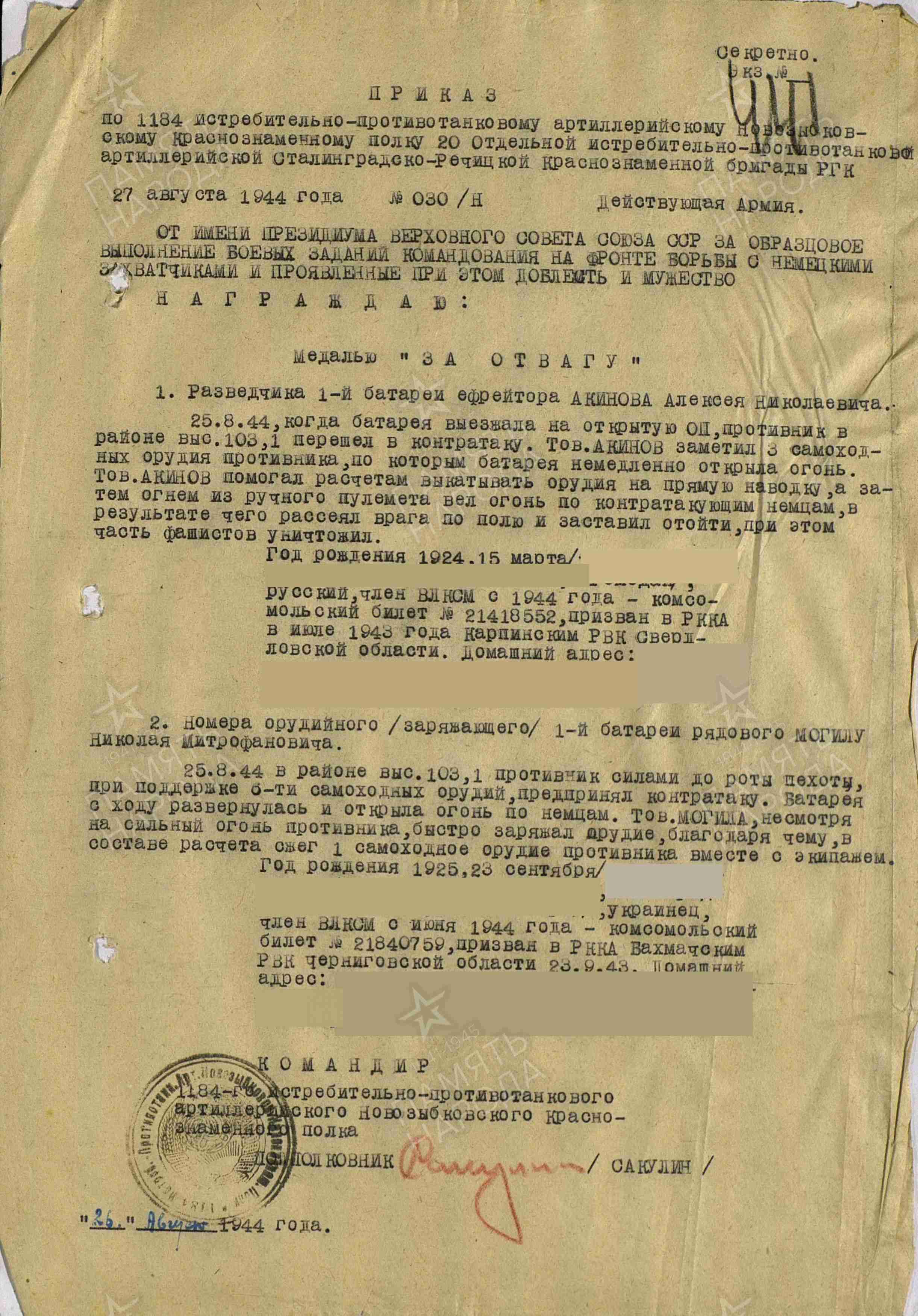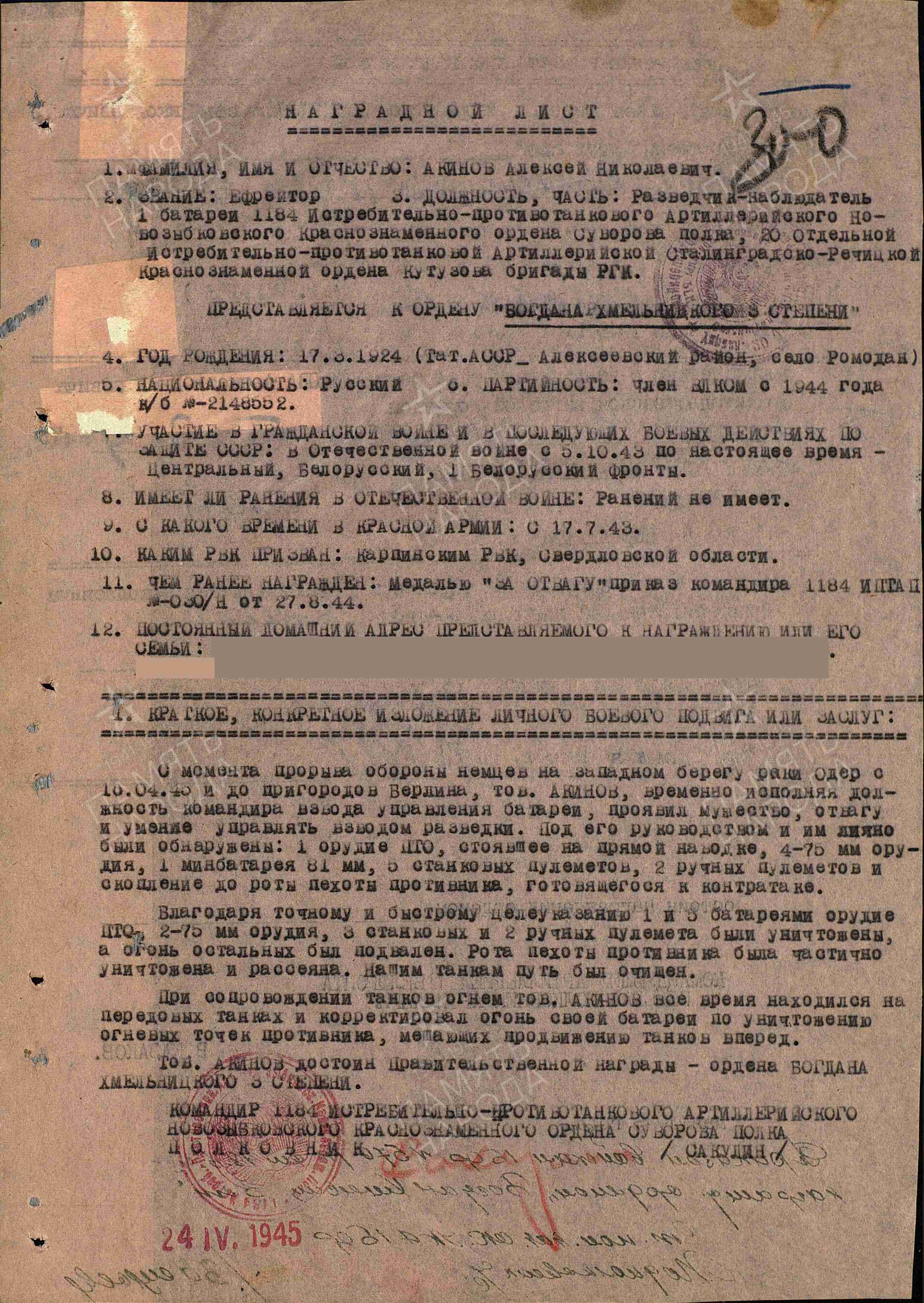 АКИНОВ Алексей Николаевич, 1924, с. Ромодан. Член ВЛКСМ. Мобилизован 20 июля 1943 Карпинским РВК Свердловской обл. Ефрейтор, разведчик 1184 ИПТАП 20 Отд. ИПТАБр РГК. Воевал на Центральном, Белорусском, 1 Белорусском фронтах. Награждён орденом Богдана Хмельницкого 3 ст., медалями «За отвагу», «За взятие Берлина».
