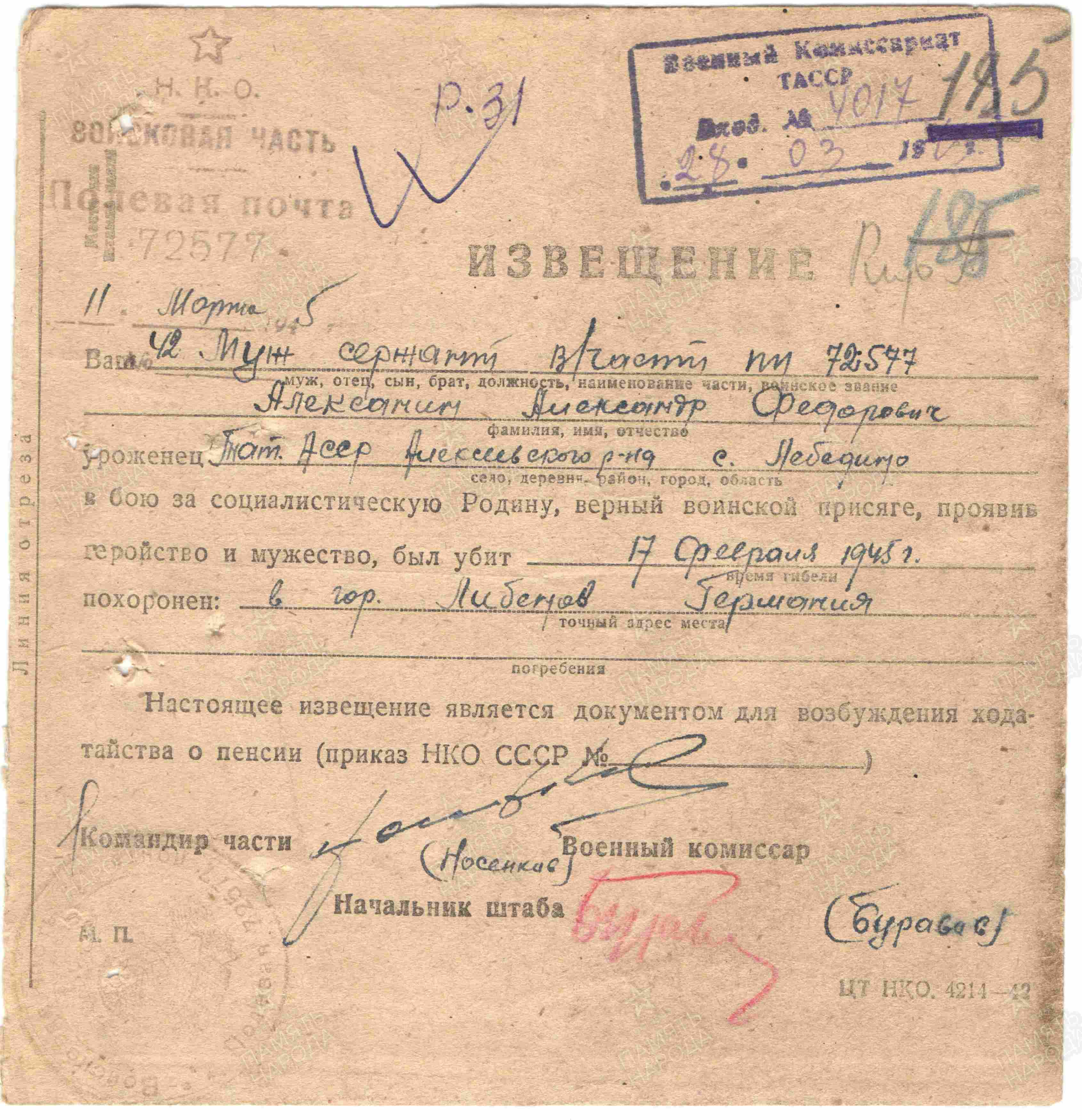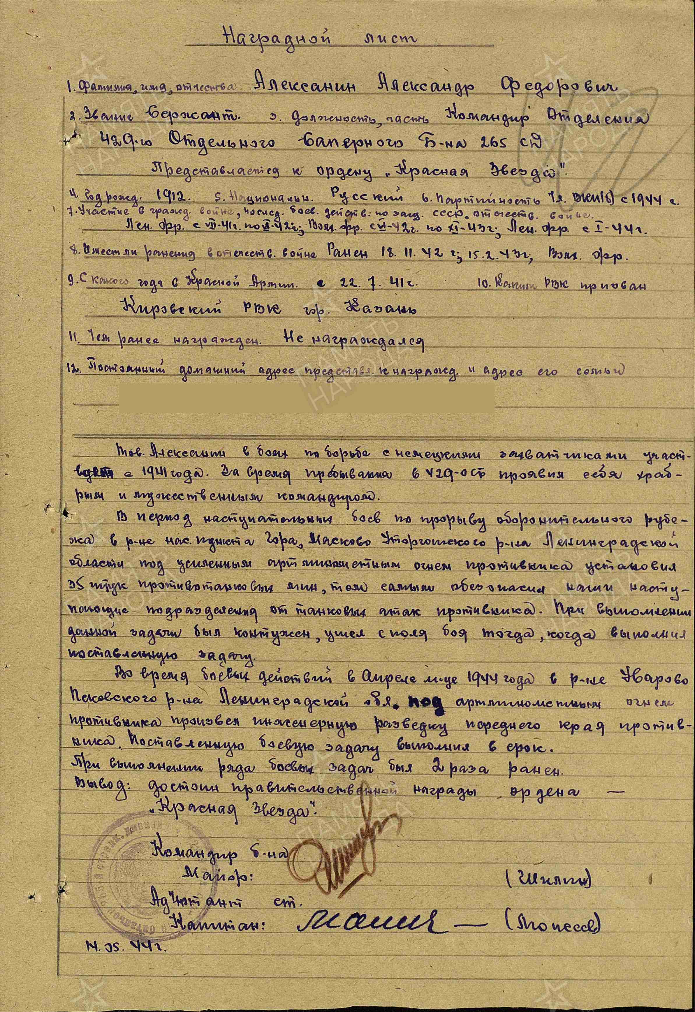 АЛЕКСАНИН Александр Фёдорович, 1912, с. Лебедино. Мобилизован Кировским РВК г. Казань 22 июля 1941. Член ВКП(б). Воевал на Ленинградском, Волховском, 3 и 2 ПрибФ, 1 БелФ. Сержант, ком. отделения отд. лыжного батальона и 429 отд. сапёрного батальона 265 СД в составе 8А и 3 УдА. Дважды ранен и контужен: 18.11.1942, 15.02.1943. Представлялся к ордену Красной Звезды. Награждён медалями «За отвагу», «За оборону Ленинграда». Погиб 17 фев. 1945, г. Либенов, Германия.