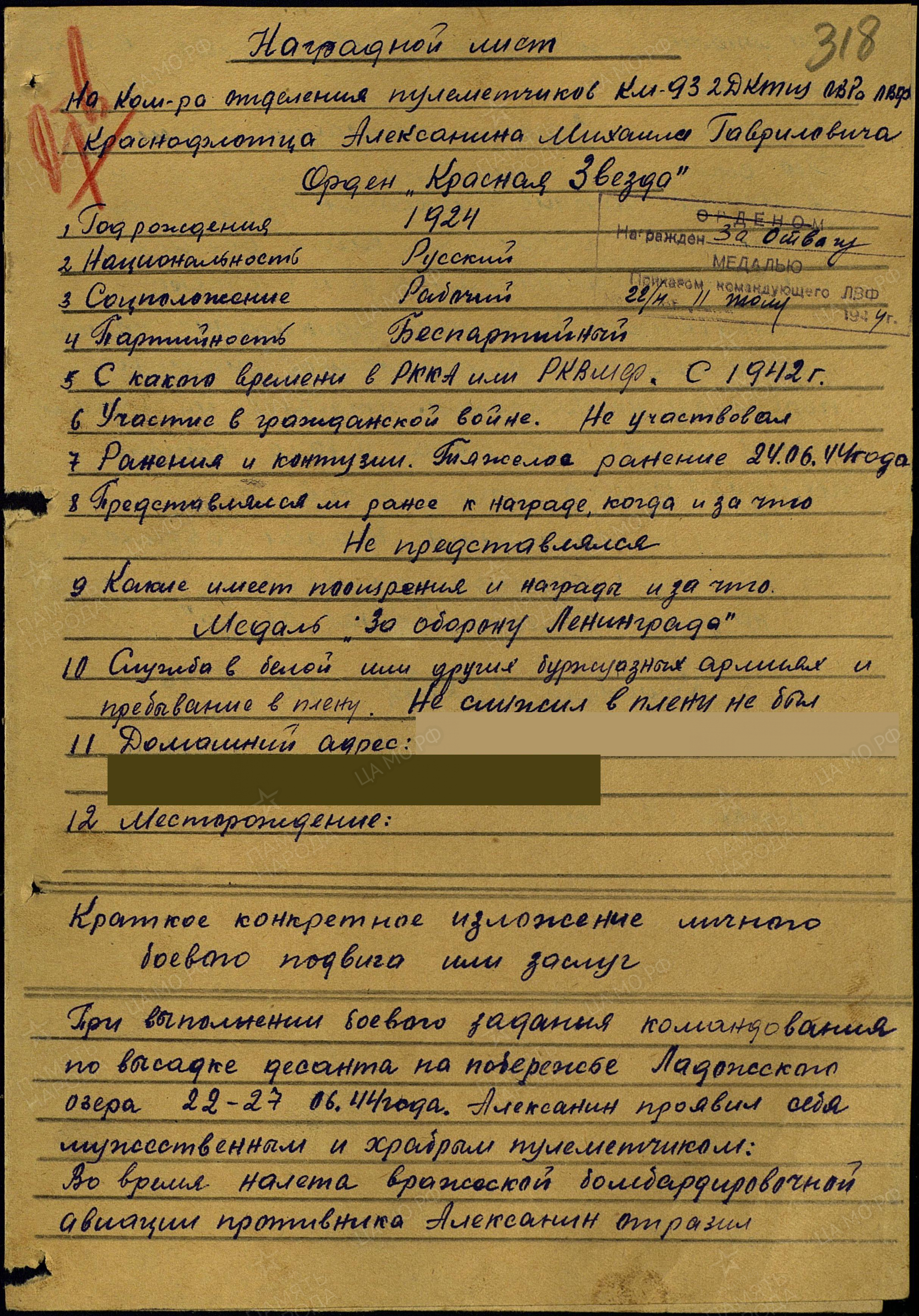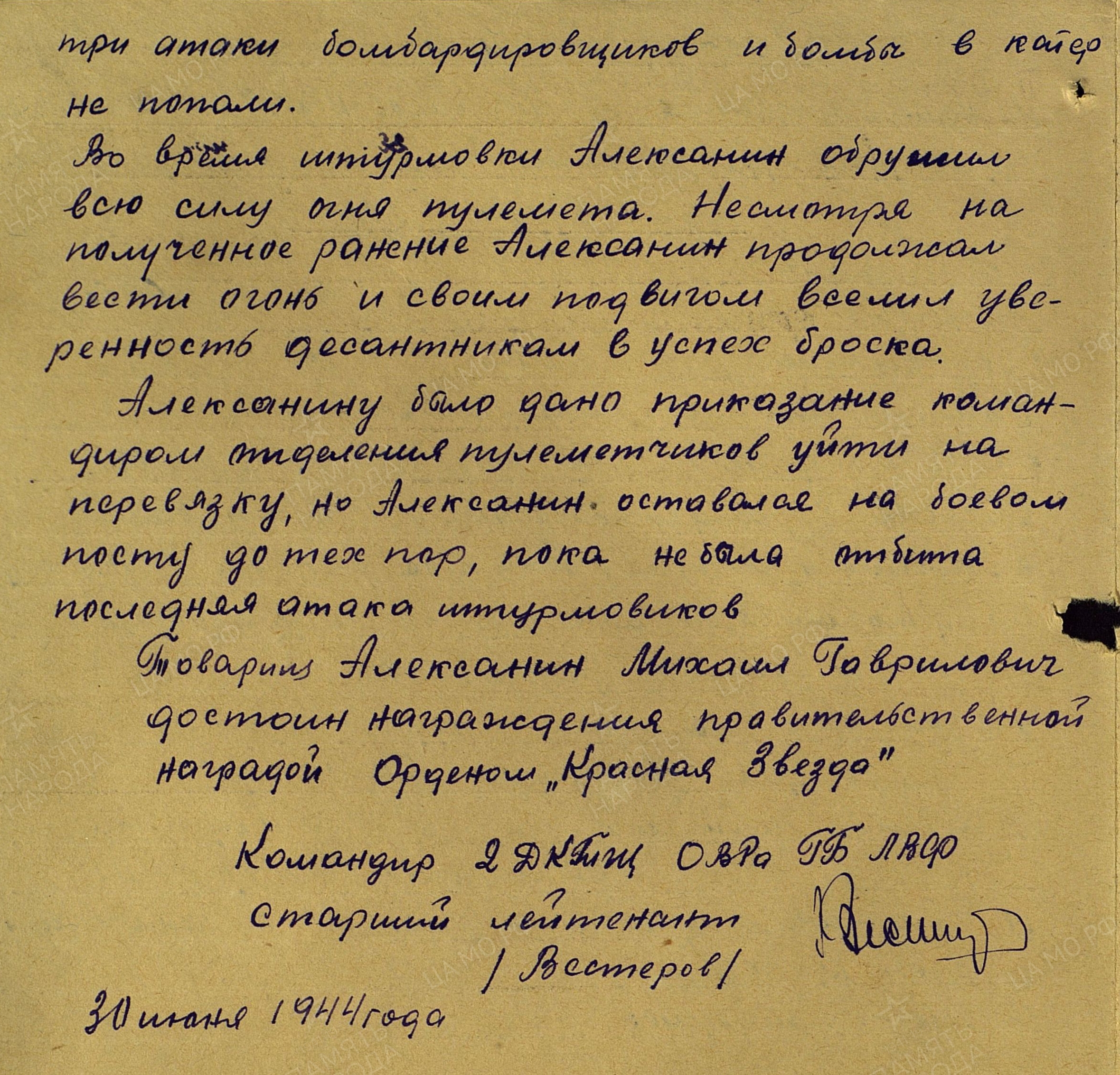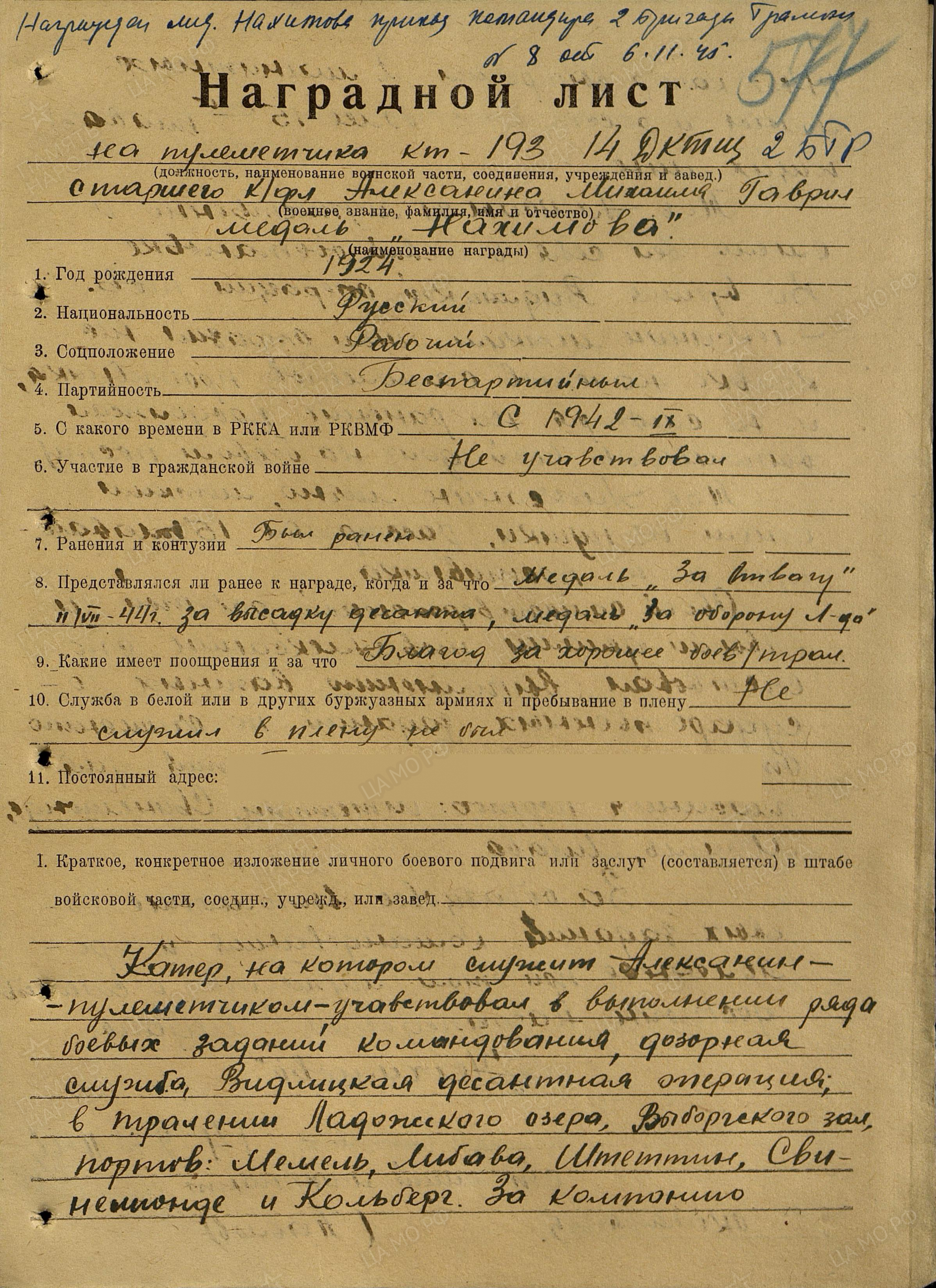 АЛЕКСАНИН Михаил Гаврилович, 1924, с. Берёзовая Грива. Мобилизован Лаишевским РВК в авг. 1942. Ст. краснофлотец, ком. отделения пулемётчиков катера КМ-93 2 дивизиона катеров-тральщиков Охраны водного района Главной базы Ладожской военной флотилии, катера КМ-193 14 дивизиона катеров-тральщиков 2 бригады траления Краснознамённого Балтийского флота. Был тяжело ранен во время обеспечения прикрытия высадки десанта на побережье Ладожского озера 24 июня 1944. Отразил три атаки бомбардировщиков. Несмотря на ранение продолжал вести огонь по самолётам, оставаясь на своём посту. Участвовал в Видлицкой десантной операции, тралении Ладожского озера, Выборгского залива, портов Мемель, Либава, Штеттин, Свинемюнде, Кольберг. Катер вытралил две магнитные и расстрелял 15 плавающих мин. Представлен к ордену Красной Звезды. Награждён медалями "За оборону Ленинграда", "За отвагу", Нахимова, орденом Отечественной войны 2 ст. (1985г.).