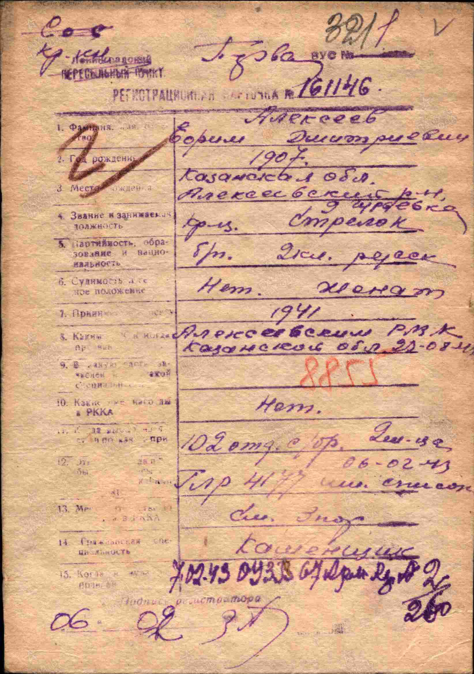 АЛЕКСЕЕВ Ефим Дмитриевич, 1907, д. Гурьевка. Мобилизован 28 авг. 1941 Алексеевским РВК (по другим данным – Чернобаевским РВК Полтавской обл. УССР), повторно мобилизован 17 нояб. 1942 Столбищенским РВК. Красноармеец, 102 отд. СБр 67 А Ленинградского фронта. Ранен 20 янв. 1943 в боях по прорыву блокады Ленинграда. Проходил лечение ЭГ 920, ГЛР 4177, г. Ленинград. Дальнейшая судьба не установлена.