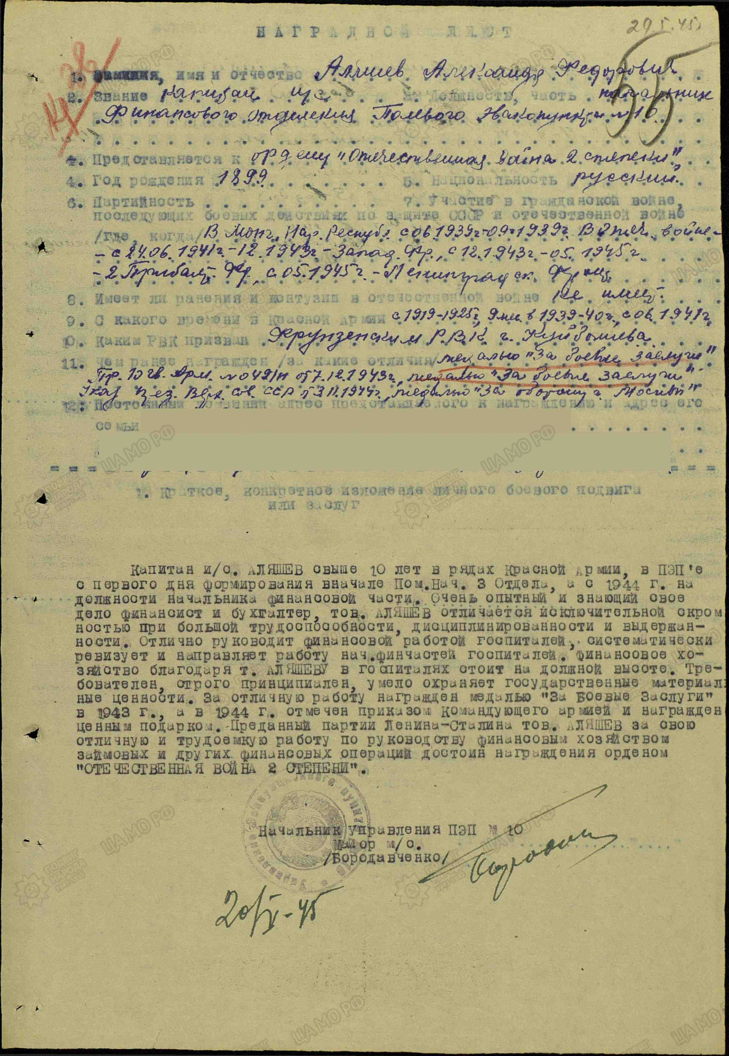 АЛЯШЕВ Александр Фёдорович, 1899, с. Алексеевское. Служил в РККА в 1919-1925 гг. Участвовал в Гражданской войне. В 1939 г. принимал участие в боевых действиях на р. Халхин Гол. В 1940 г. участвовал в Советско-финской войне. На Великую Отечественную войну мобилизован 23 июня 1941 г. Фрунзенским РВК г. Куйбышев (Самара). Капитан интендантской службы, нач.фин. полевого эвакопункта №10 1-й Армии Западного, 2 Прибалтийского фронта. Начальник финансового отдела Управления ПЭП 1 Дальневосточного фронта. Награждён медалями "За оборону Москвы", "За победу над Японией", двумя медалями "За боевые заслуги" (1943, 1944), орденом Красной Звезды (1945, представлялся дважды в мае и сентябре 1945 г.), орденом Отечественной войны 2 ст. (1985).