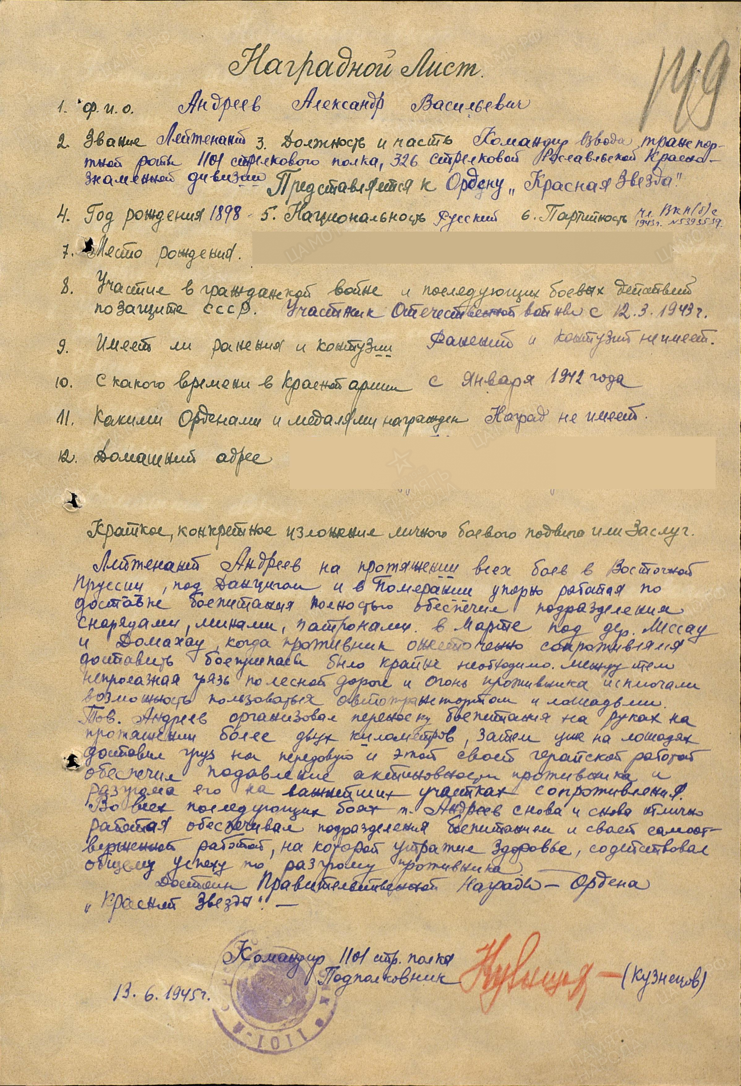 АНДРЕЕВ Александр Васильевич, 1898, с. Мараса. Мобилизован Билярским РВК в 1941. Член ВКП(б). Участник войны с 12 марта 1943. Ком. взвода транспортной роты 1101 СП 326 СД 16, 50, 10 А ЗапФ, 3 УдА 2 ПрибФ, 42 и 67 А ЛенФ и 3 ПрибФ, 2 УдА 2 БелФ. Участвовал в освобождении Смоленской и Псковской областей, Эстонии и Польши, в боях за Данциг (Гданьск) и в Восточной Пруссии. Дважды представлялся к ордену Красной Звезды. Награждён двумя медалями "За отвагу".