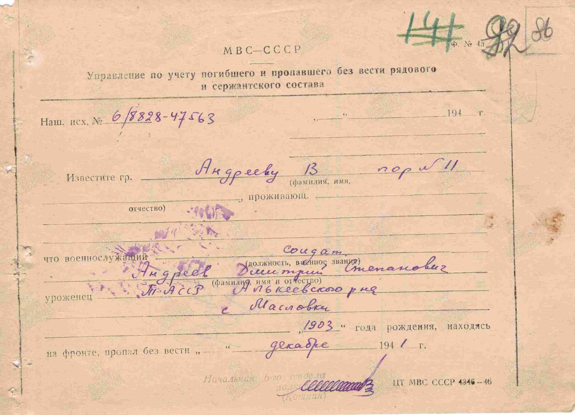 АНДРЕЕВ Дмитрий Степанович, 1903, с. Масловка. Мобилизован Сталинским РВК г. Казань 25 авг. 1941. Красноармеец. Пропал без вести.