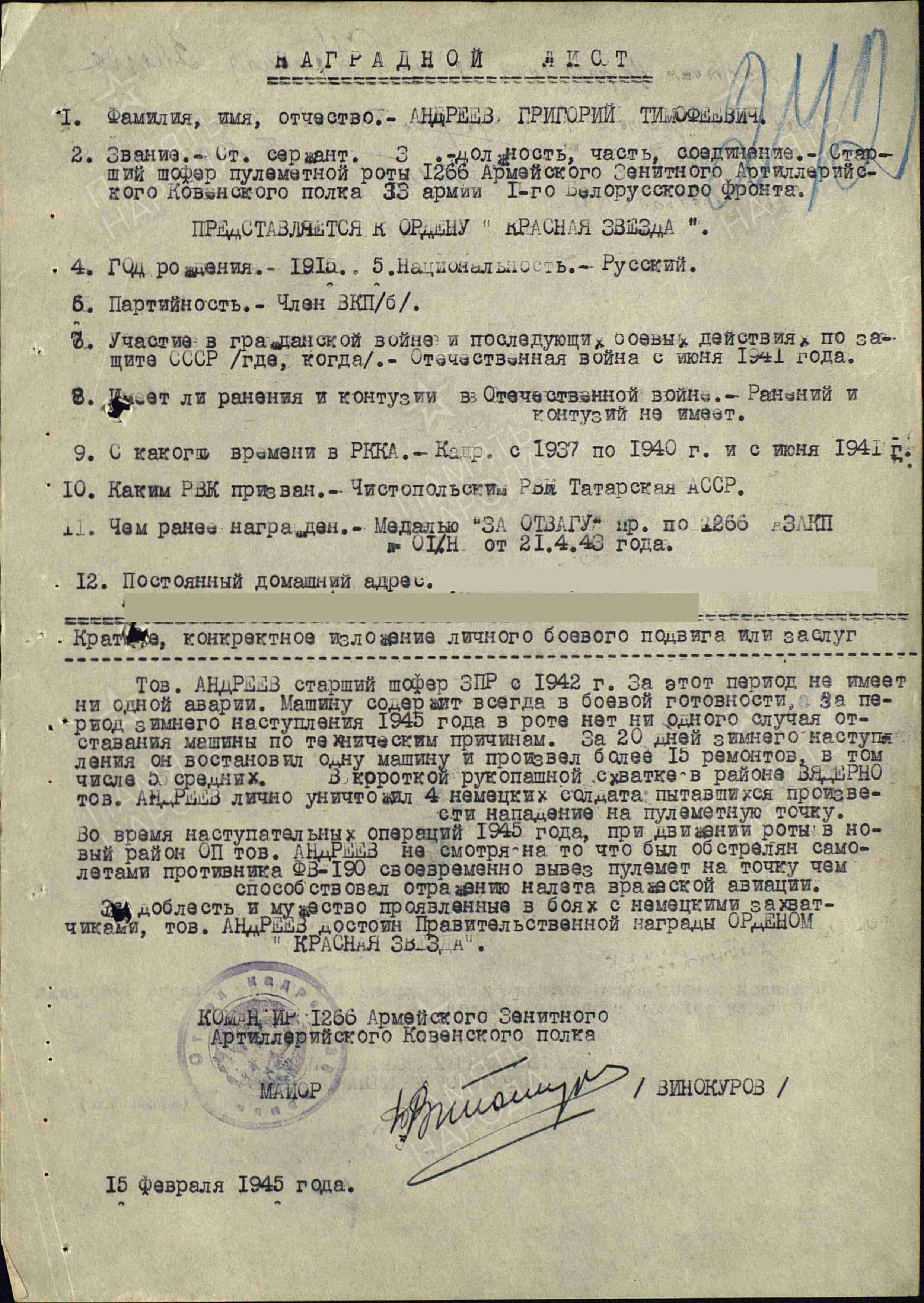 Из приказа о награждении от 21.04.1943 г.: «Шафера зенитно-пулеметной роты – старшего сержанта Андреева Григория Тимофеевича за то, что он 16 марта 1943 года при противовоздушной обороне продвигающихся частей восстановил подорвавшуюся на вражеской мине автомашину с зенитно-пулеметными установками, чем обеспечил своевременное прикрытие с воздуха д.Тишино. Через реку Волоста мост был взорван, а лед взломан старший сержант Андреев первым провел свою машину в брод, а затем буксировал все машины роты, чем обеспечил своевременное прикрытие с воздуха 12 гвардейского стрелкового полка и 2-го дивизиона 24 гвардейского арт.полка.»