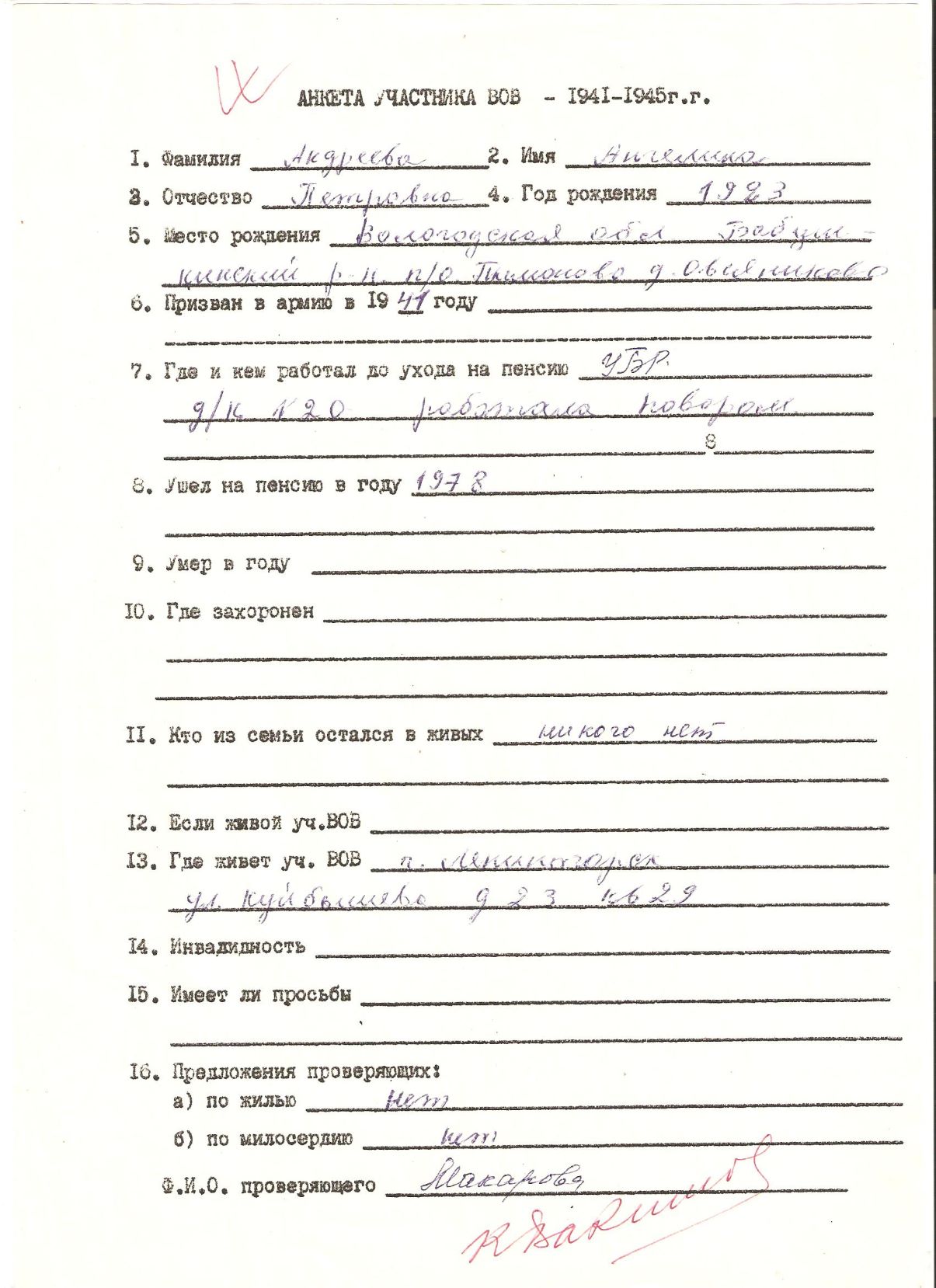Родилась в 1923 году в д. Овсянниково Бабушкинского района Вологодской области. мобилизована в 1941 году. После войны работала поваром в ЛУБР.