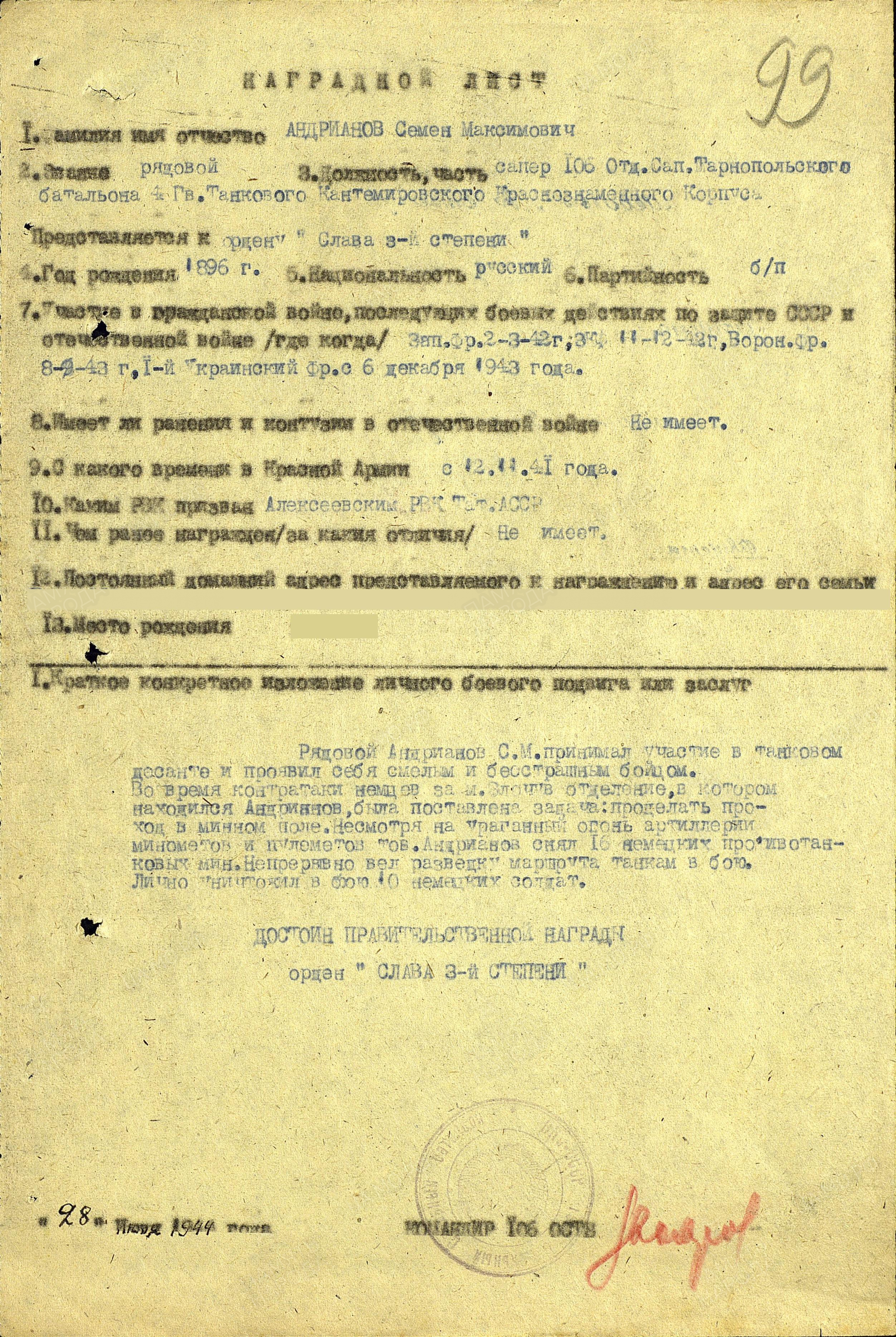 АНДРЕАНОВ Семён Максимович, 1896, с. Остолопово. С 1935 г. вступил в колхоз "Красное Прикамье". Мобилизован Алексеевским РВК в ноябре 1941. Красноармеец. Воевал на Западном, Воронежском, 1 Укр. фронтах. Сапёр 106 отд. саперного батальона 4 гв. ТК. В 1944 представлен к ордену Славы 3 ст., награждён медалью "За отвагу". По документам общего собрания колхоза в 1946 г. в списках на награждение колхозников медалью "За доблестный труд в Великой Отечественной войне 1941-1945 гг." отмечен как бригадир, участник Великой Отечественной войны.