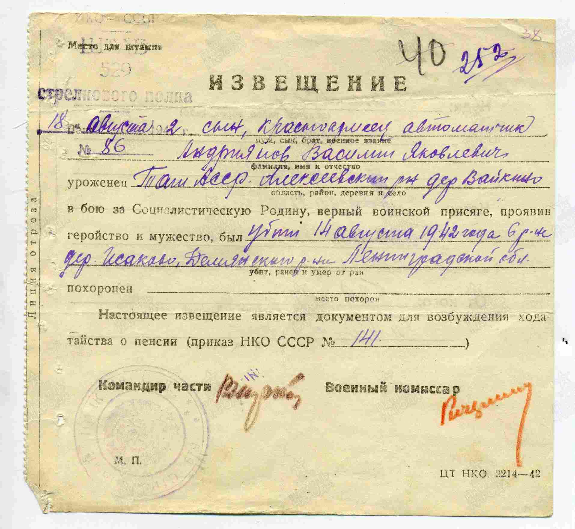 АНДРИАНОВ (АНДРИЯНОВ) Василий Яклвлевич, 1920, д. Войкино. Мобилизован Алексеевским РВК в 1940. Курсант учебного подразделения в Забайкальском военном округе (53 ДШ). Осуждён военным трибуналом ЗабВО 22 июля 1941 к 4 годам ИТЛ. Направлен на фронт. В 1942 – красноармеец, 529 СП 163 СД 34 А Северо-Западного фронта. Убит в бою и оставлен на поле боя 14 авг. 1942, д. Исаково, Демянский р-н, Новгородская обл.