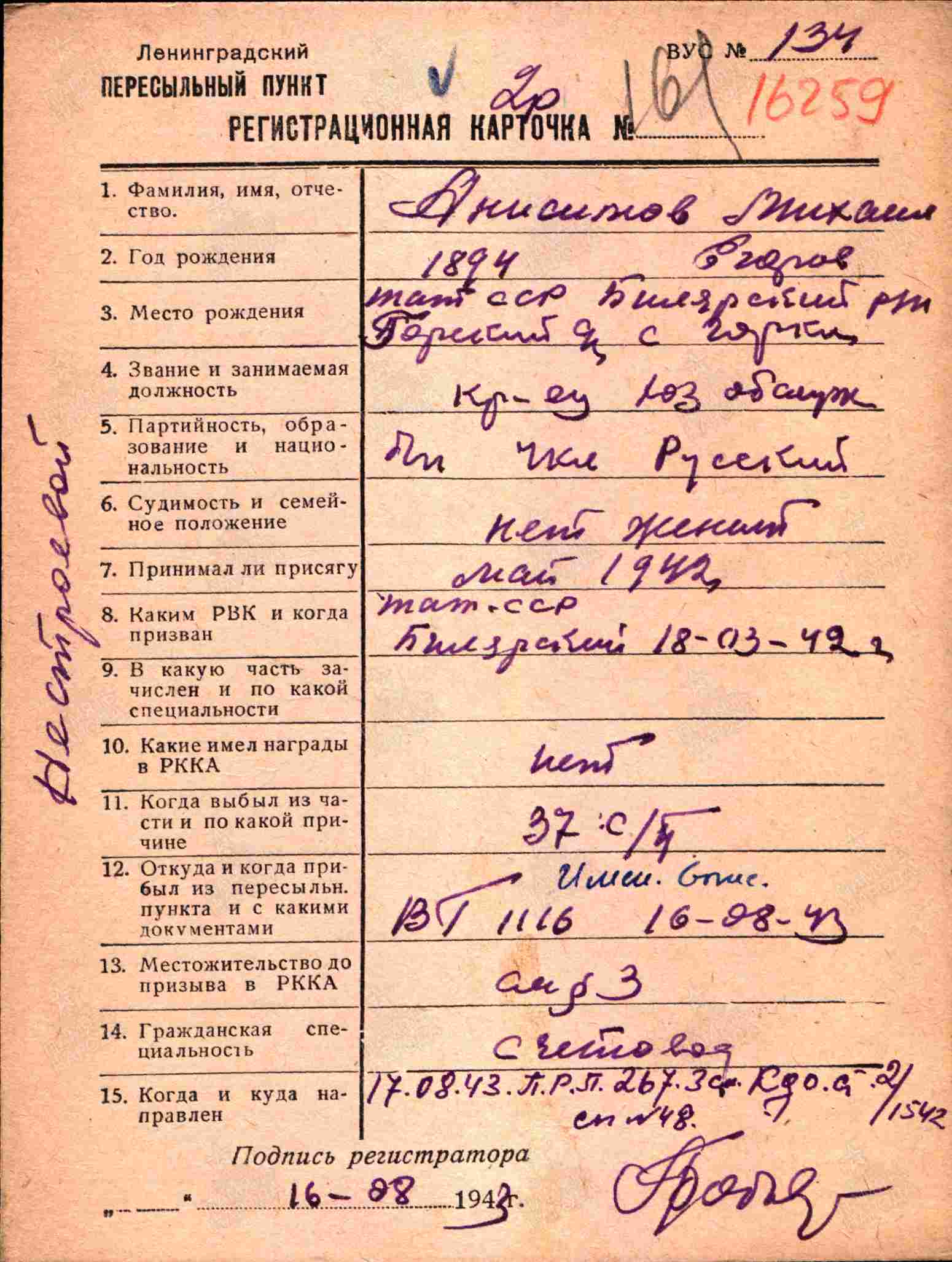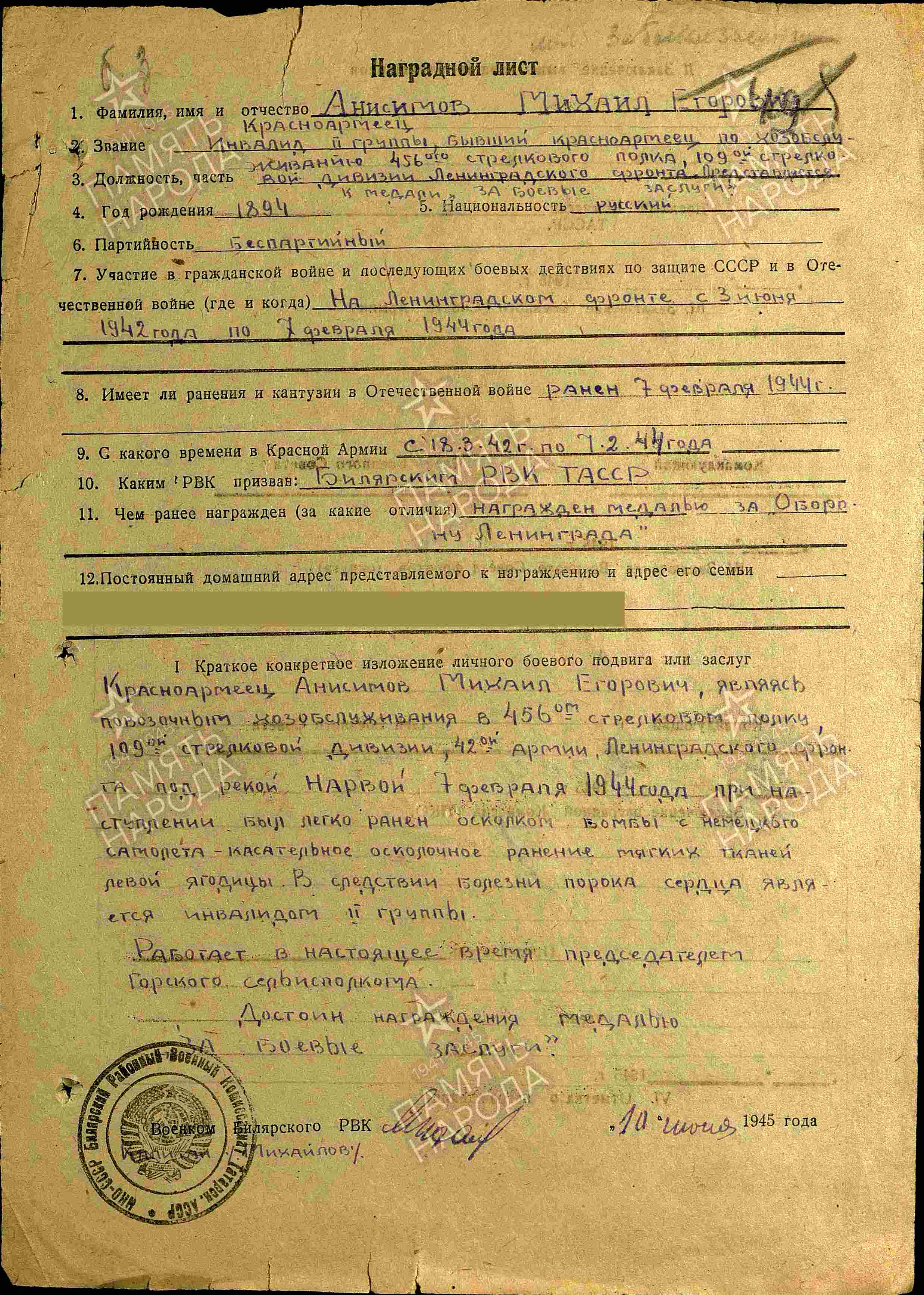 АНИСИМОВ Михаил Егорович, 1894, с. Богоявленская Горка. До призыва в армию трудился в к-зе "Красная Горка". Мобилизован Билярским РВК 18 марта 1942. Красноармеец 37 СП 56 СД Ленинградского фронта. Был ранен. Находился на излечении в ЭГ 1116, ЭГ 5115, г. Ленинград. Направлен в 456 СП 109 СД 42 А ЛенФ. 7 фев. 1944 был ранен осколками авиабомбы на р. Нарва. После излечения в ЭГ 1173 служил в хозчасти 456 СП. Инвалид войны 2 гр. Награждён медалями «За оборону Ленинграда», «За боевые заслуги». После демобилизации работал председателем Горского сельисполкома.