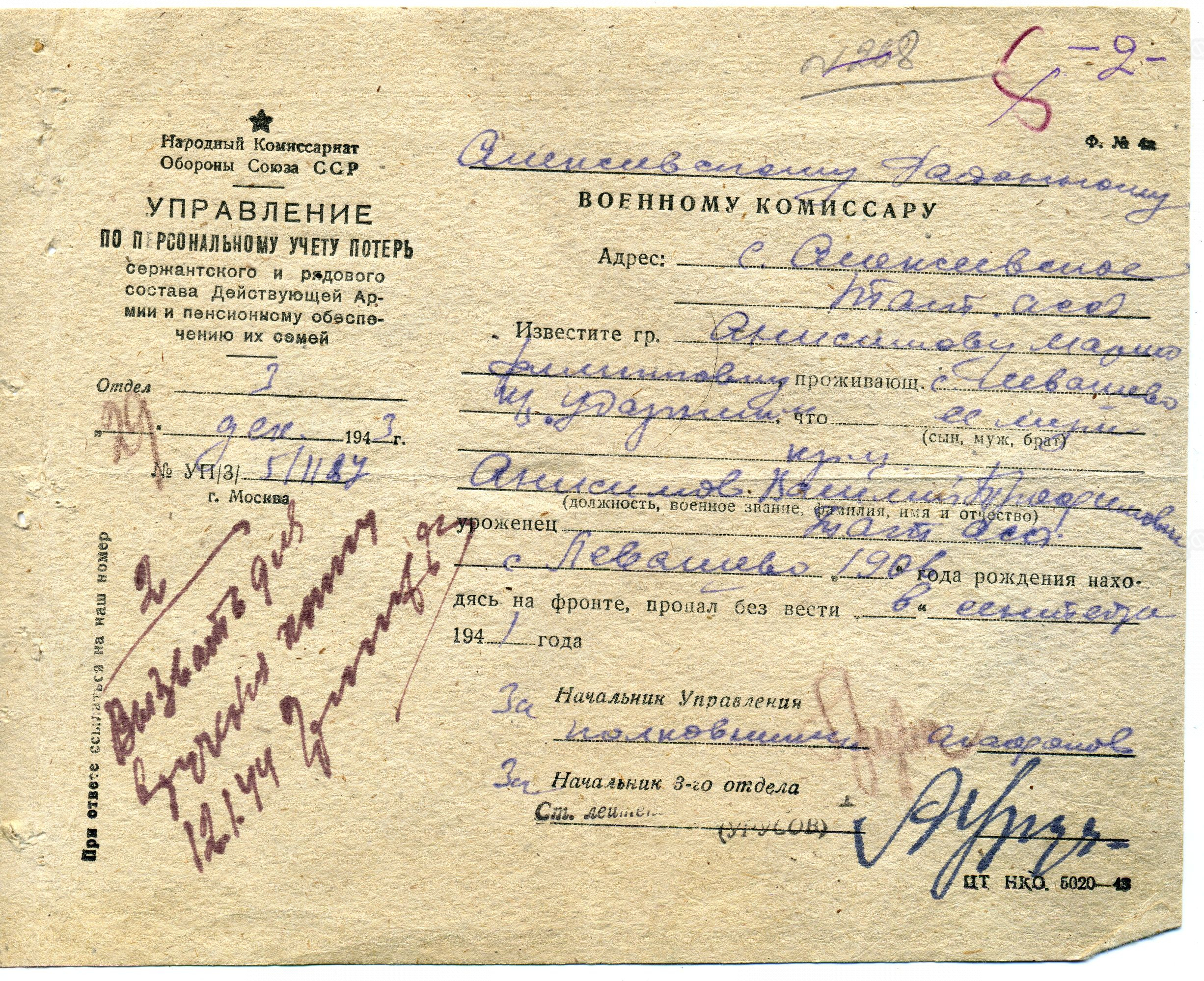 АНИСИМОВ Василий Трофимович, 1906, с. Левашево. Мобилизован Алексеевским РВК 13 июля 1941. Красноармеец, полевая почта 60 89/2. Предположительно прибыл на фронт в составе 23 СД 27 А Северо-Западного фронта. Погиб (пропал без вести) в р-не Демянска, Новгородская обл. в сентябре 1941.